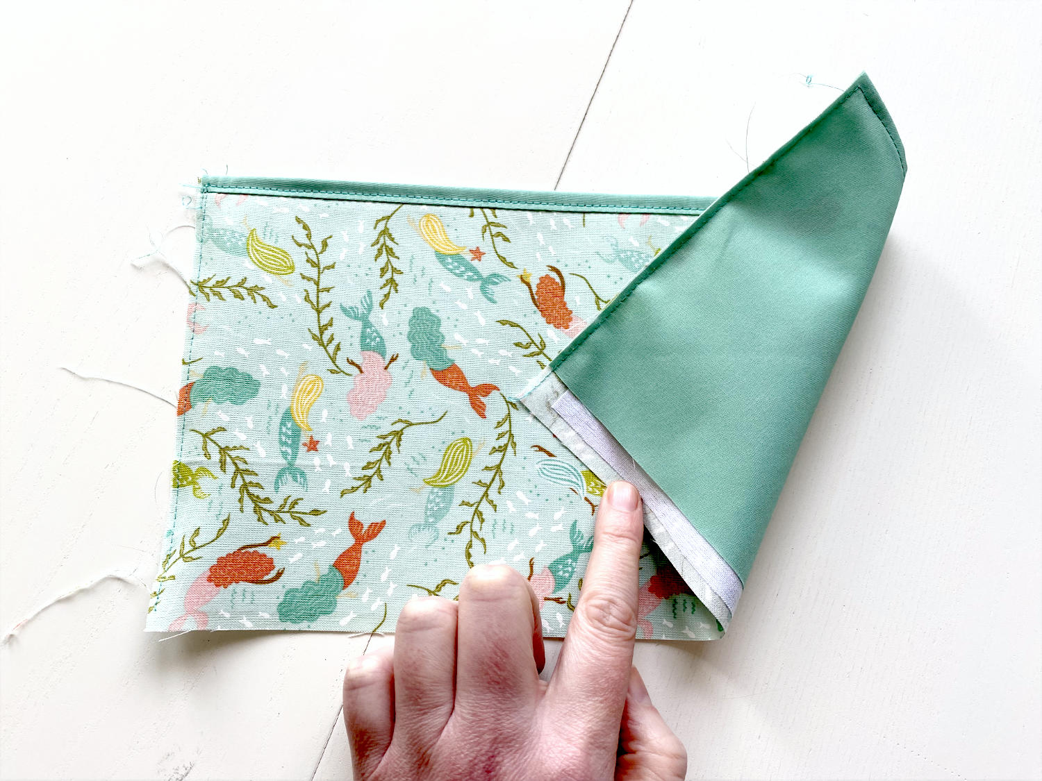 Wenn du die Tasche wie auf dem vorherigen Bild vor dir liegen hast, greifst du die beiden unteren Ecken und ziehst sie nach unten, bis sie aufeinander liegen. Nähe sie auf der bereits vorhandenen Naht zusammen.