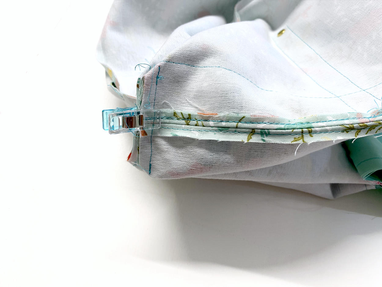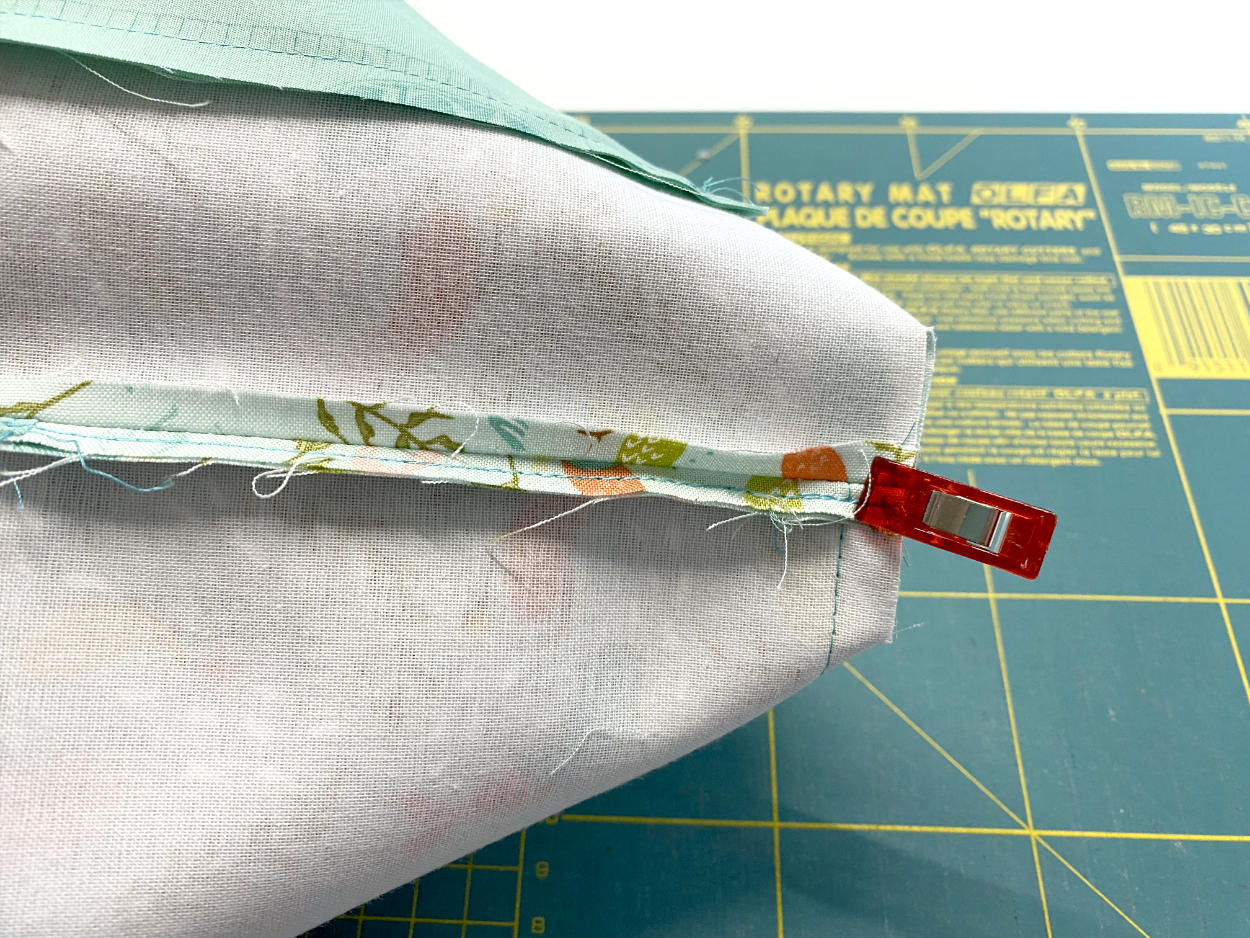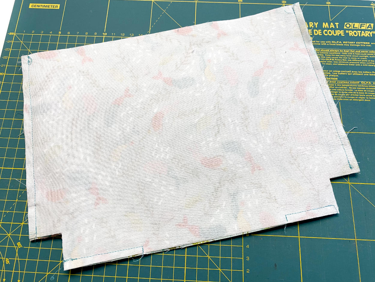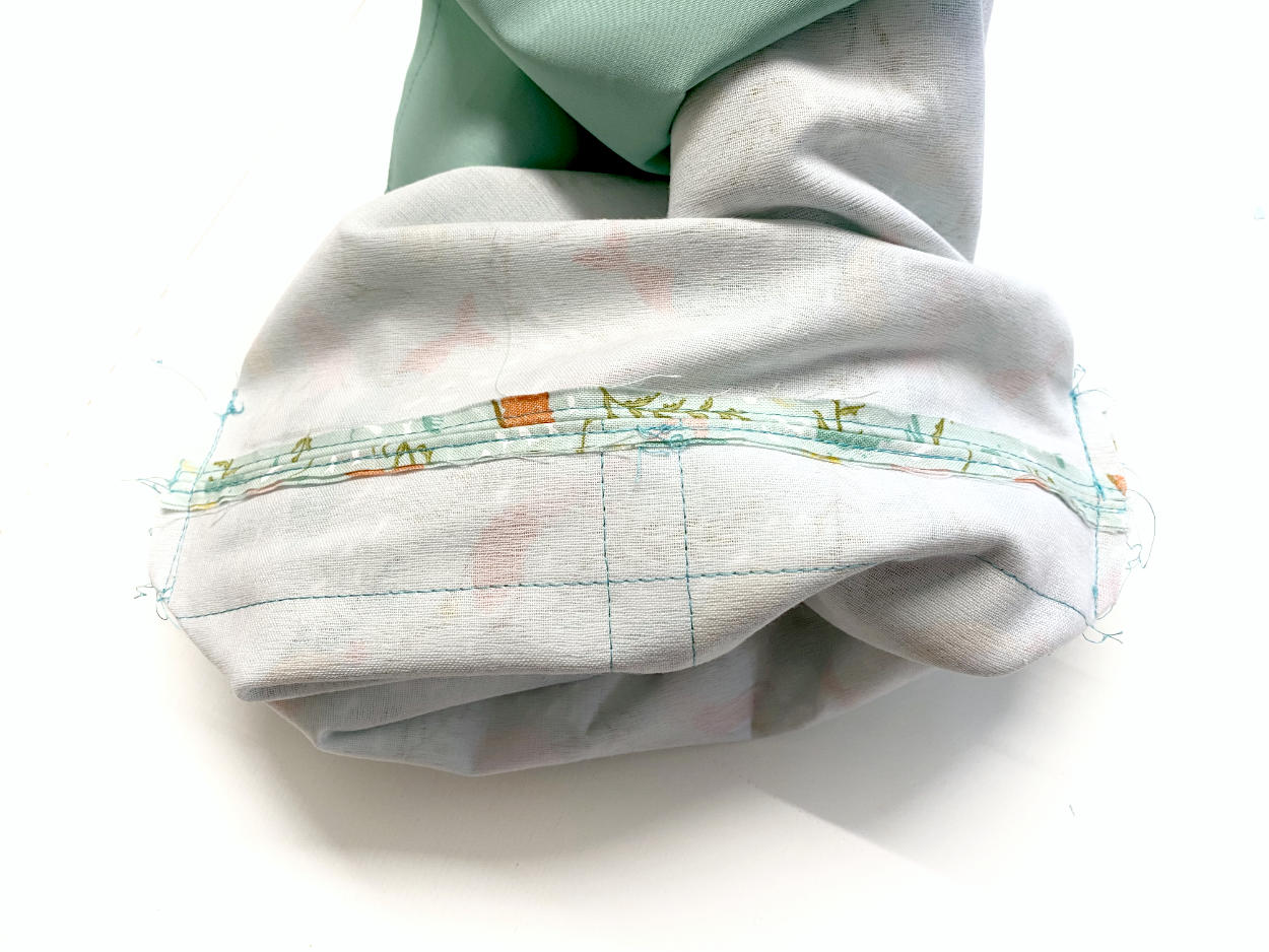 Der Innenstoff ist nun auf der Rückseite etwas kürzer als der Außenstoff. Das ist in Ordnung und später nicht mehr zu sehen. Nähe die kurzen Kanten mit einer Hilfsnaht zusammen.