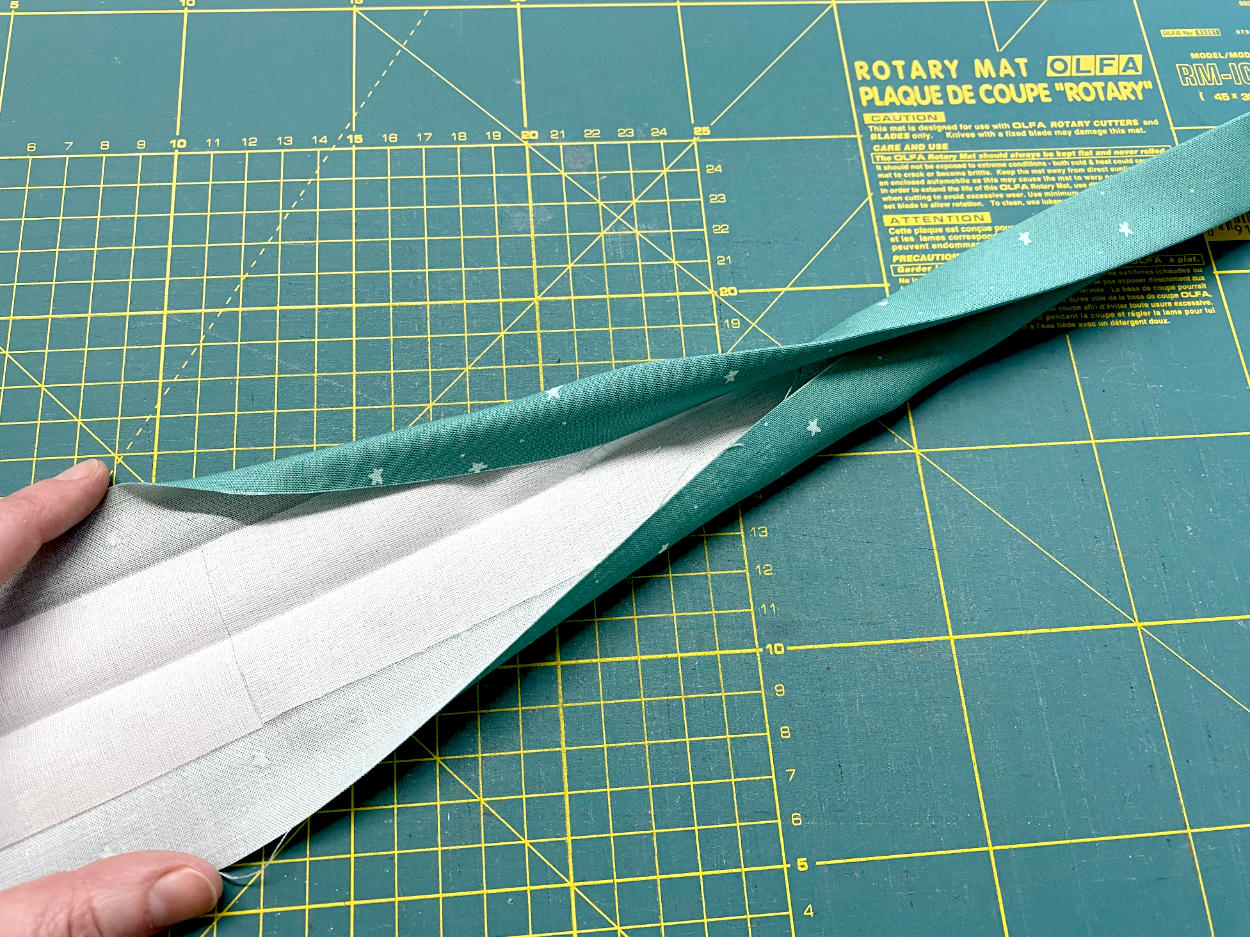 Bügele den kompletten Gurt der Länge nach links auf links zur Hälfte, klappe ihn wieder auseinander und klappe dann die offenen Kanten bis zur Mittelfalz nach innen. Nochmal bügeln und dann nochmal zur Mitte falten, sodass du einen vierlagigen Streifen erhälst.