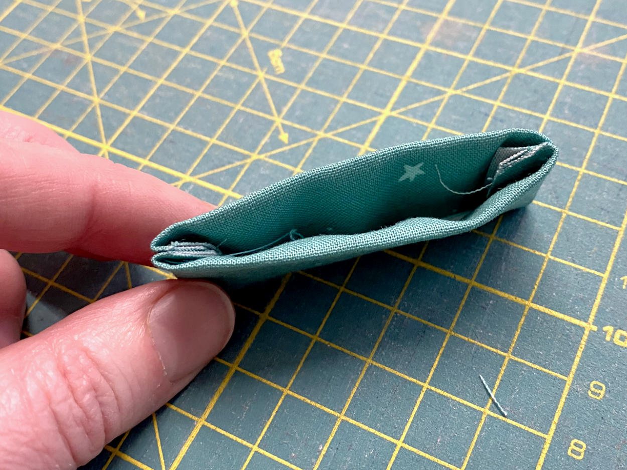 Bei Option 2 verschwinden die offenen Kanten nicht in der Naht der Tasche, sondern sie müssen versäubert werden. Dafür klappe ich den kurzen Streifen an der Mittelfalz nicht nach innen, sondern in die andere Richtung, sodass der Streifen von der Seite etwas wie ein großes „M“ aussieht. Die beiden kurzen Enden nähe ich so zusammen und schräge die Nahtzugaben etwas ab. Dann wende ich das Teil, sodass die Nahtzugaben innen liegen, und steppe es einmal rundherum ab. Genauso gehe ich auch beim langen Gurt vor.