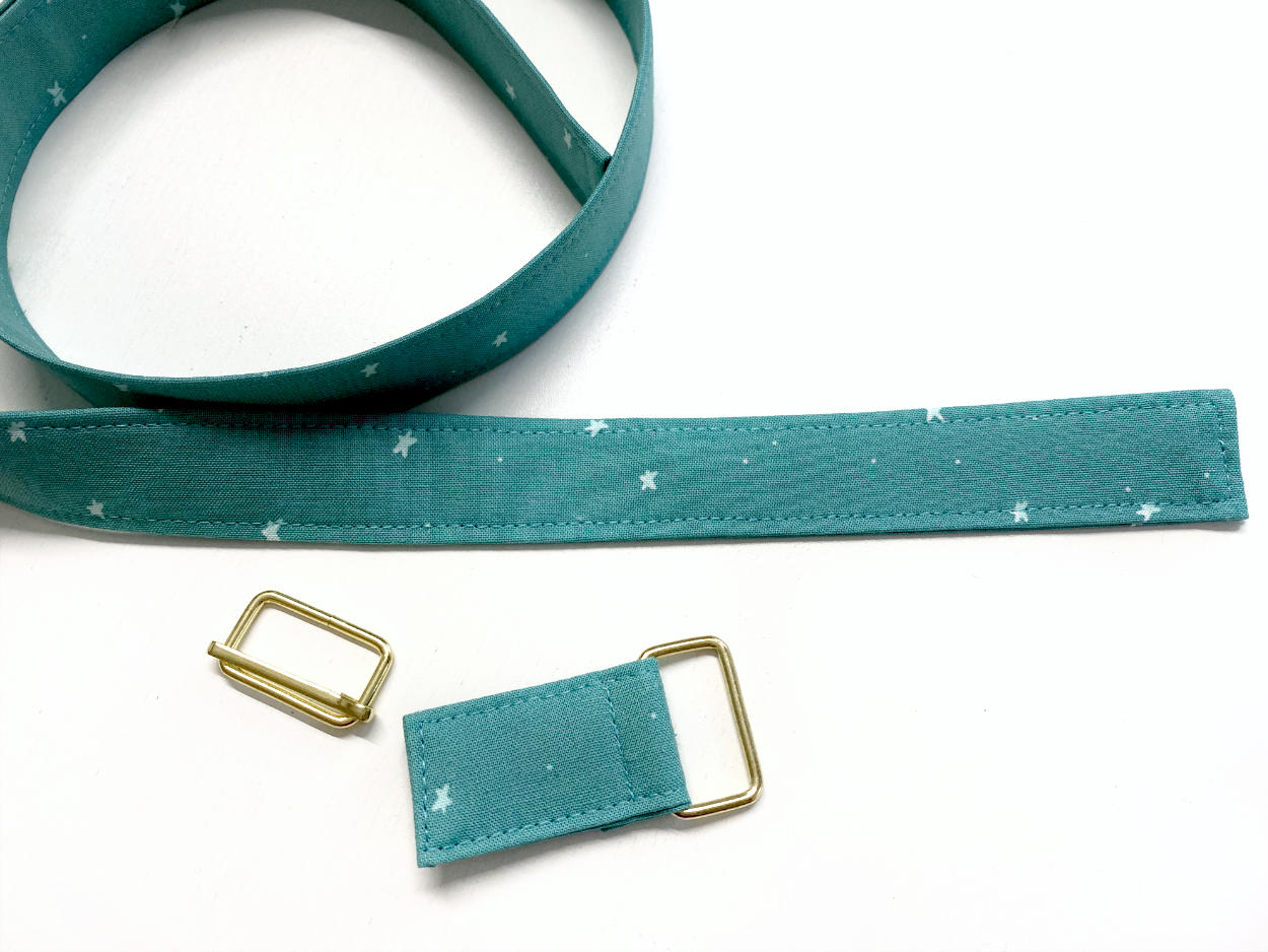 Du kannst den Gurt entweder selber nähen, dann benötigst du einen Streifen Stoff in der gewünschten Breite x4. Zum Beispiel schneidest du für einen Gurt in 2,5 cm Breite einen Streifen von 10 cm.