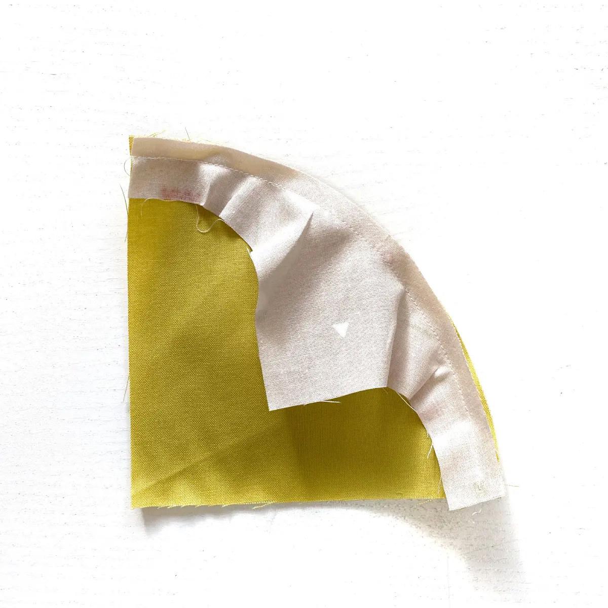Klappe die beiden Teile auseinander und bügele die Nahtzugabe in Richtung Viertelkreis. Die Falten sollten jetzt alle verschwunden sein. Je nach Quiltmuster kann es sein, dass du die Nahtzugaben auch in die andere Richtung bügelst, aber das sollte dann in der jeweiligen Anleitung stehen.
