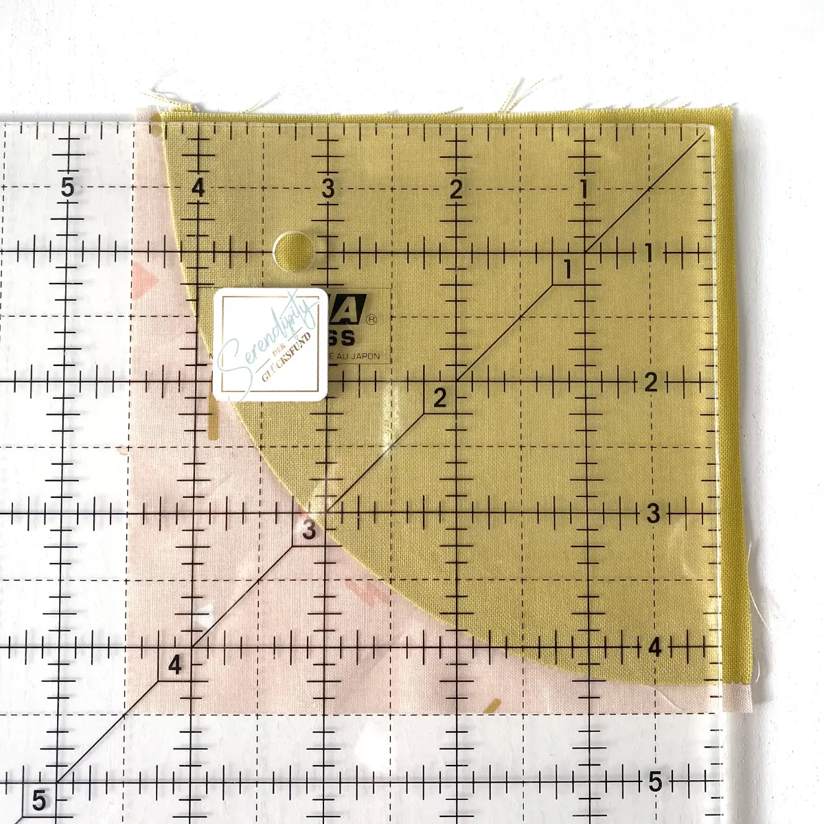 Lege dein Patchwork-Lineal mit der ¼-Inch-Markierung genau an die Kante des Viertelkreises und kürze den Block hier ein. Die waagerechte Markierung auf dem Lineal (in diesem Fall die 5 Inch Linie) sollte idealerweise auf der Kante des Blocks liegen. Das wiederholst du jetzt auf der anderen Seite, auf der der Kreis an die Kante des Blocks stösst. Achte darauf, dass du gleichzeitig einen rechten Winkel erhältst – zu sehen oben auf dem Foto, die rosa Ecke, die bei 4,5 Inch auskommt.