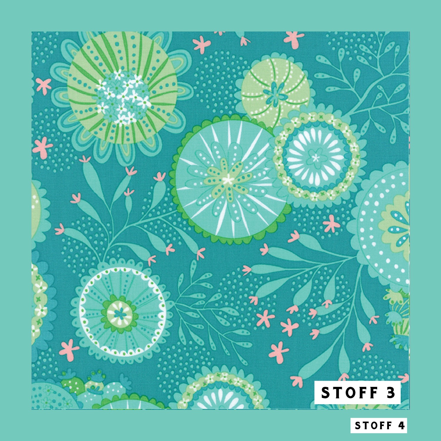 Ausgesucht hatte sie sich das Charm Pack der Moda-Serie „Manderley“ und das haben wir kombiniert mit Moda’s „Green Tea“ auf der Vorder- und „Peacock“ auf der Rückseite und dem tollen türkisen Unterwasserstoff aus der „Coral Queen of the Sea“-Kollektion. Eine super schöne und farbenfrohe Kombination!