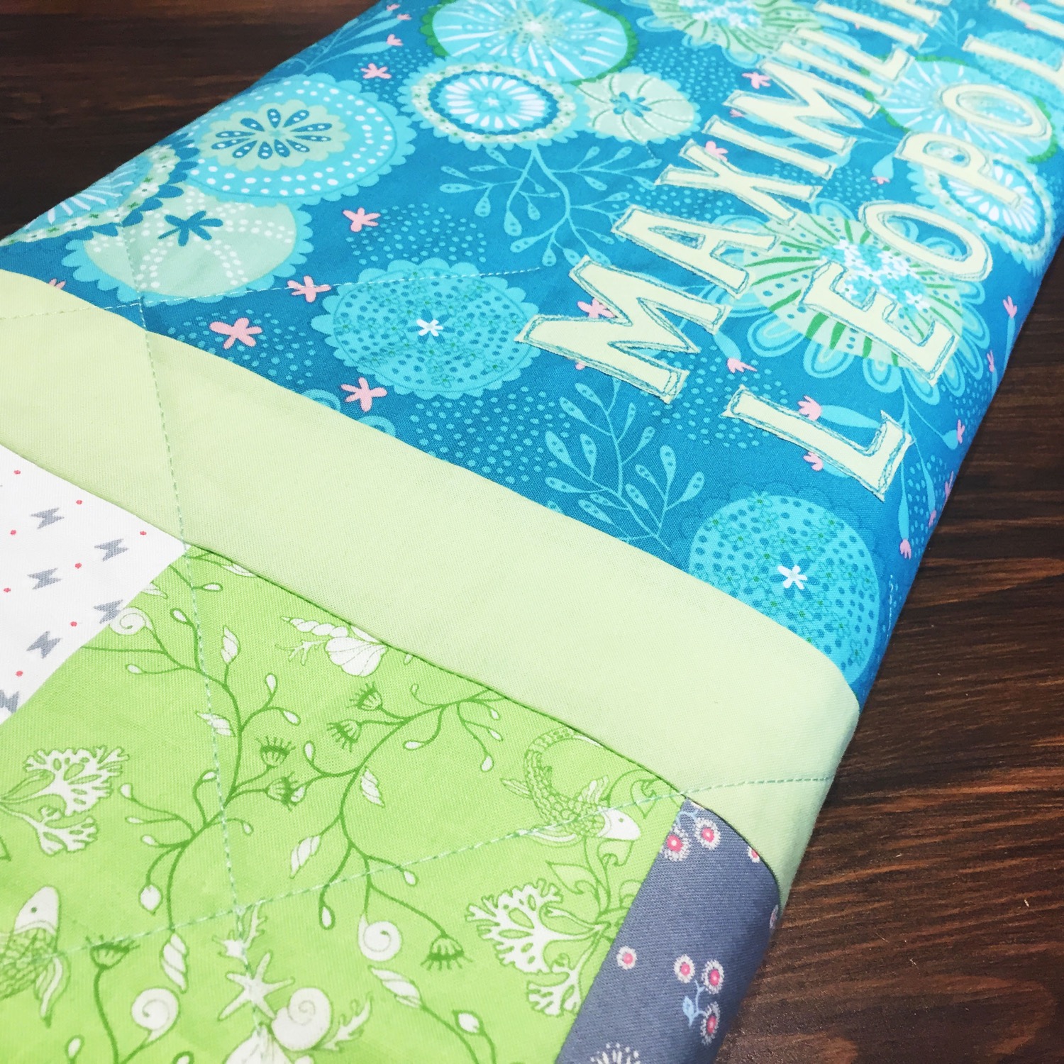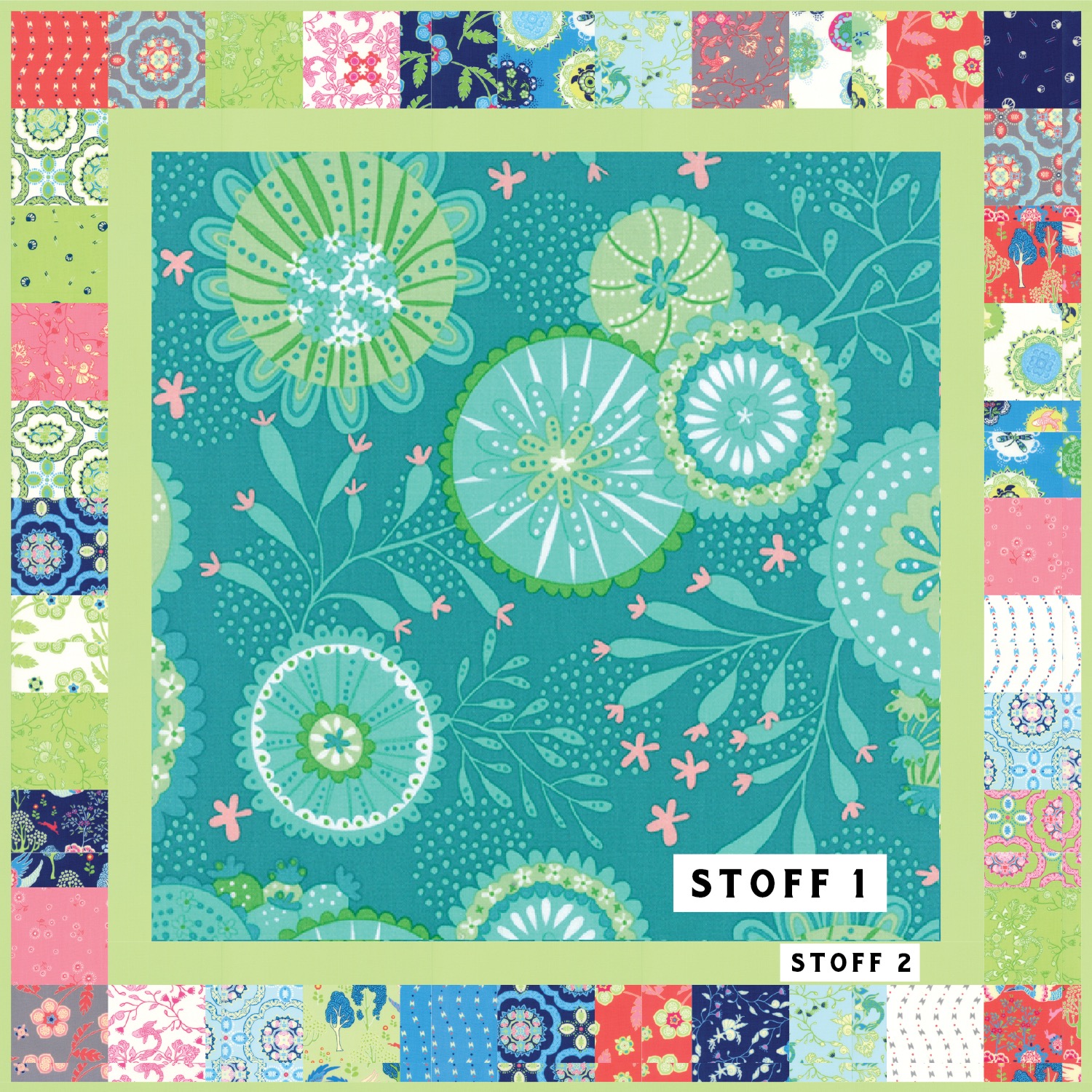 Ausgesucht hatte sie sich das Charm Pack der Moda-Serie „Manderley“ und das haben wir kombiniert mit Moda’s „Green Tea“ auf der Vorder- und „Peacock“ auf der Rückseite und dem tollen türkisen Unterwasserstoff aus der „Coral Queen of the Sea“-Kollektion. Eine super schöne und farbenfrohe Kombination!