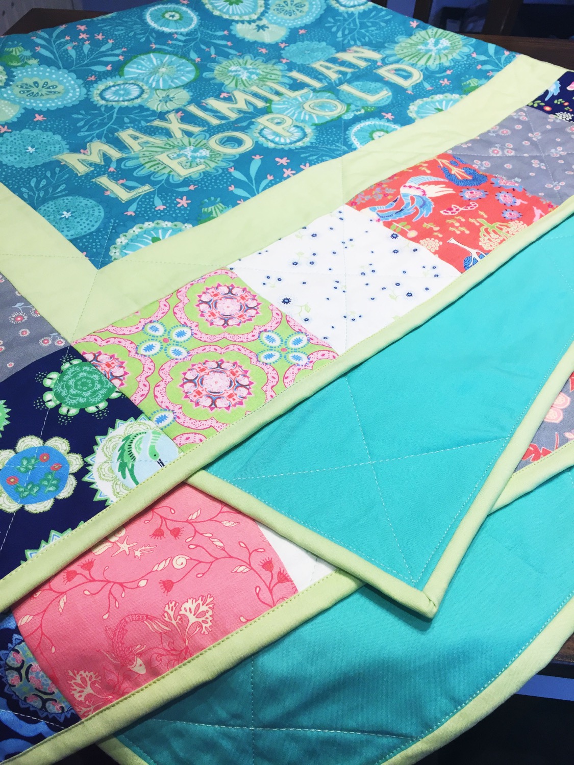 Gequiltet habe ich die Decke mit diagonalen Linien, um die kleinen Quadrate nochmal aufzugreifen. Außerdem kann man sich da gut an den vorhandenen Linien und Nähten orientieren.