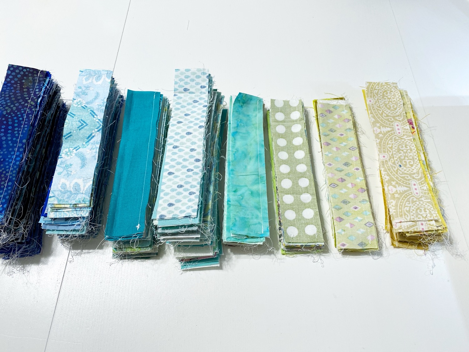 Um ein 4er-Quadrat zu nähen, brauche ich je 2 Streifen in bunt und weiß, also insgesamt 264 bunte und 264 weiße Streifen. Die Breite von 1,5 Inch habe ich ja schon bei ganz vielen meiner Reststücke, und die habe ich dann zu einer Länge von 6 – 6,5 Inch geschnitten (6 Inch brauche ich Minimum, um sie später in vier Stücke zu teilen, ein wenig Puffer kann nicht schaden).