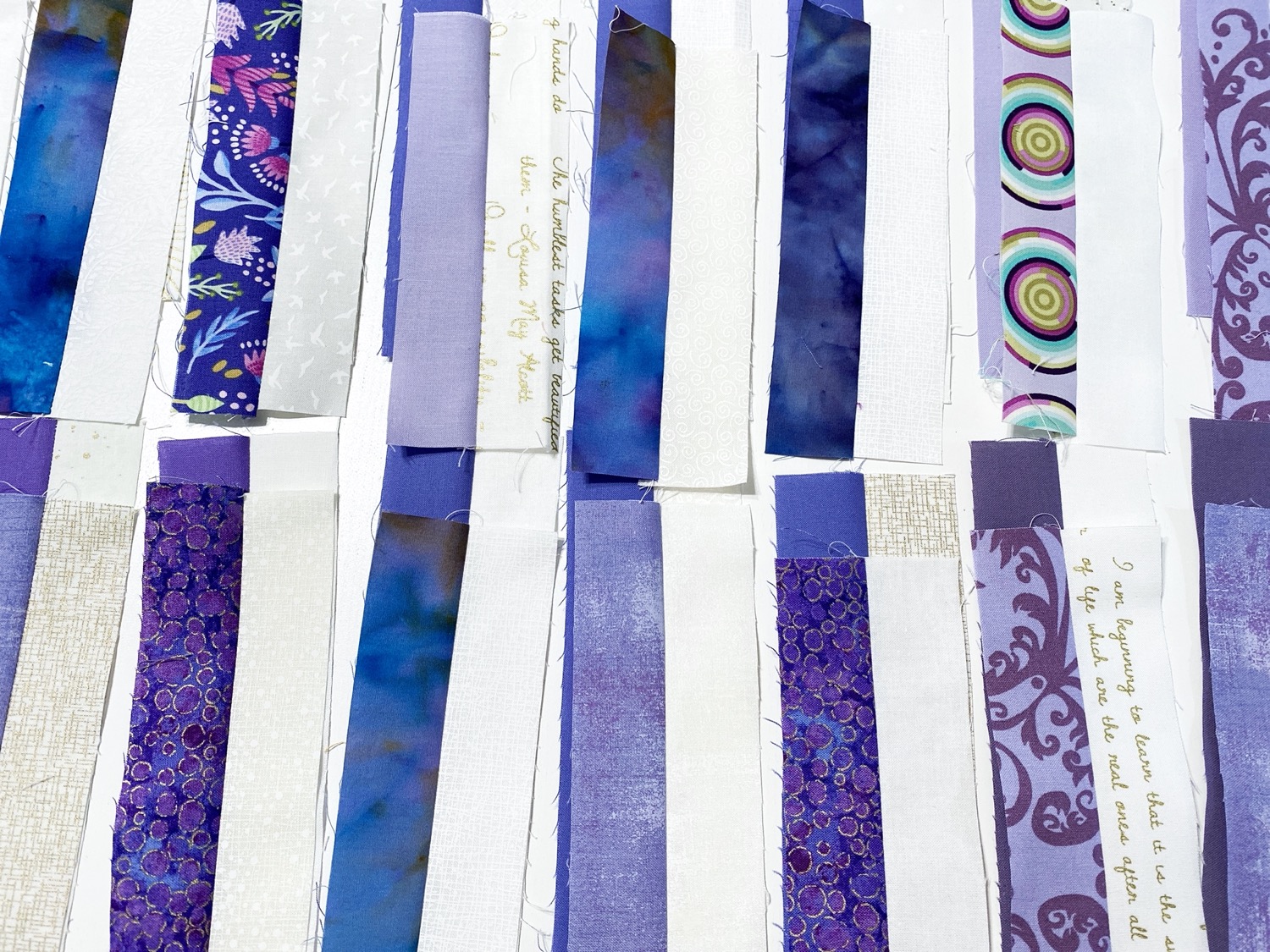 Nachdem ich alle Streifen geschnitten und die bunten nach Farben sortiert hatte, habe ich je einen bunten und einen weißen aneinander genäht.