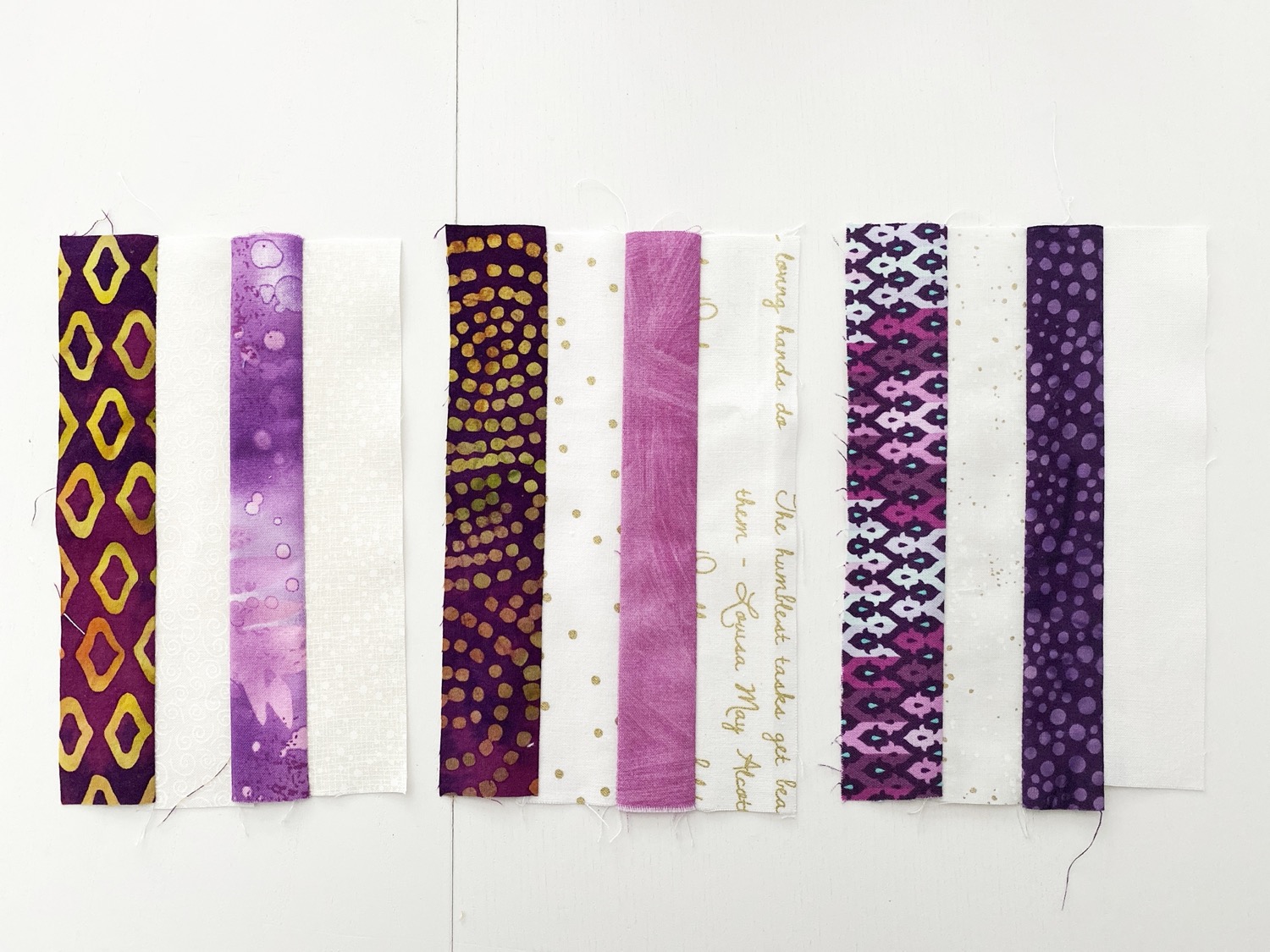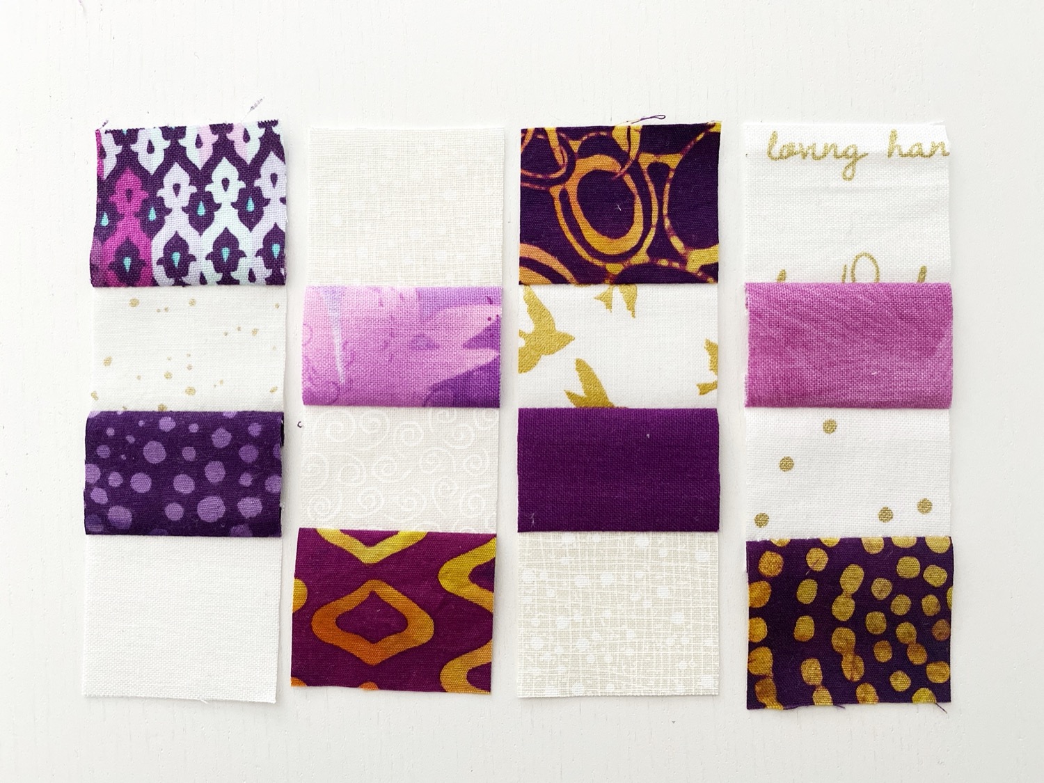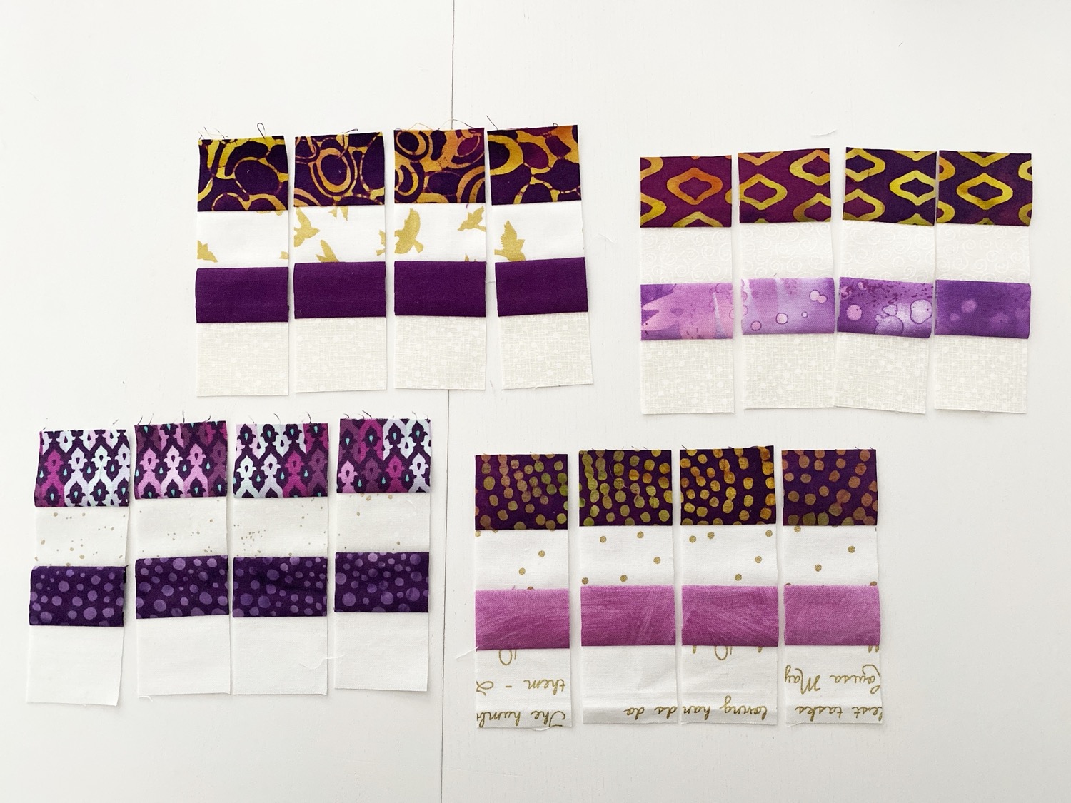 Allerdings habe ich keine Lust, einzelne Quadrate zu nähen, also arbeite ich mit Streifen und verarbeite diese zu 4 x 4 Inch Quadraten: