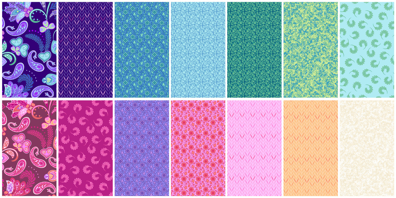 42 verschiedene Stoffstücke in 5 x 5 Inch (12,5 x 12,5 cm) aus 100 % Baumwolle. Einige der Muster können doppelt vorkommen.