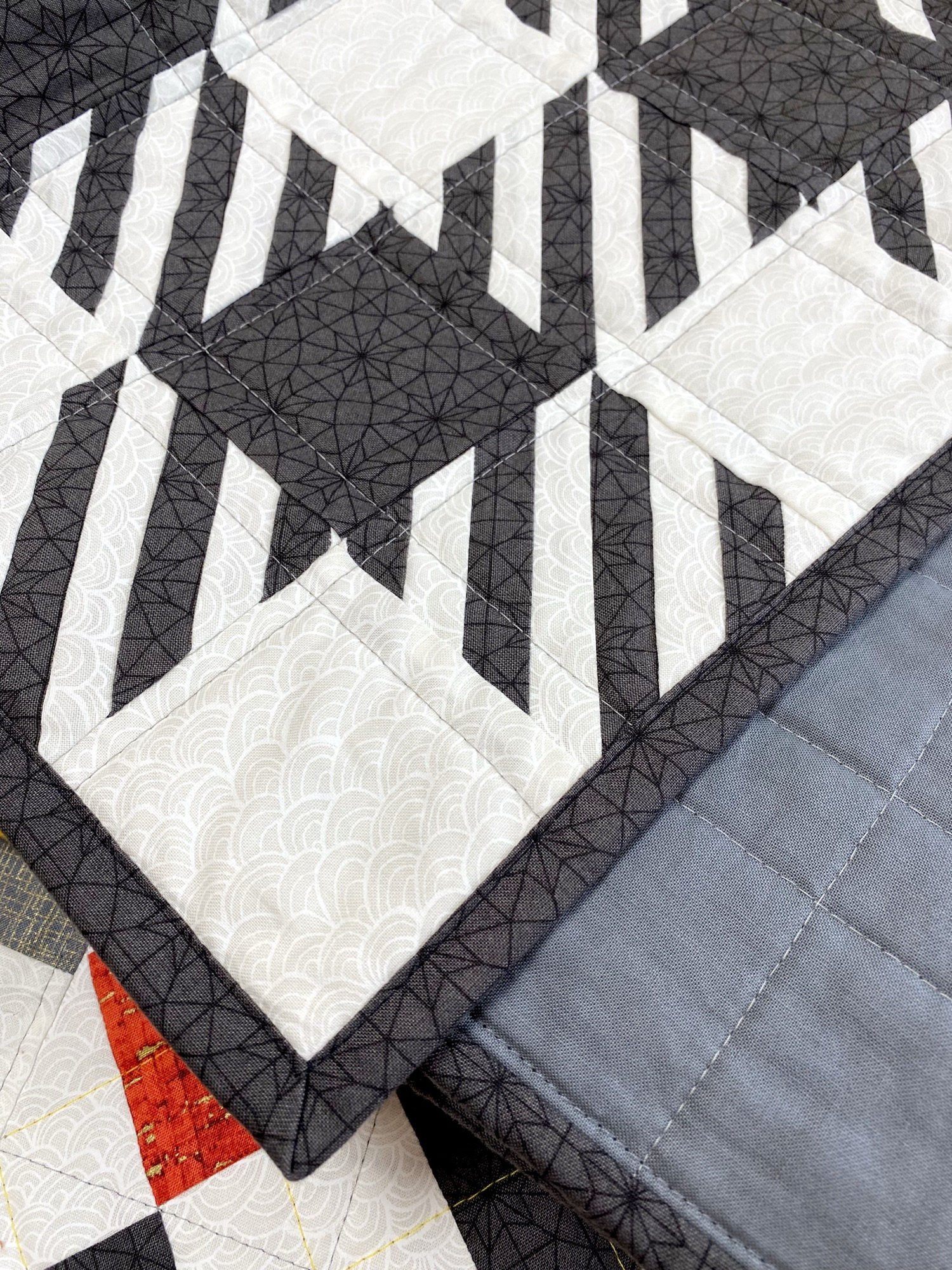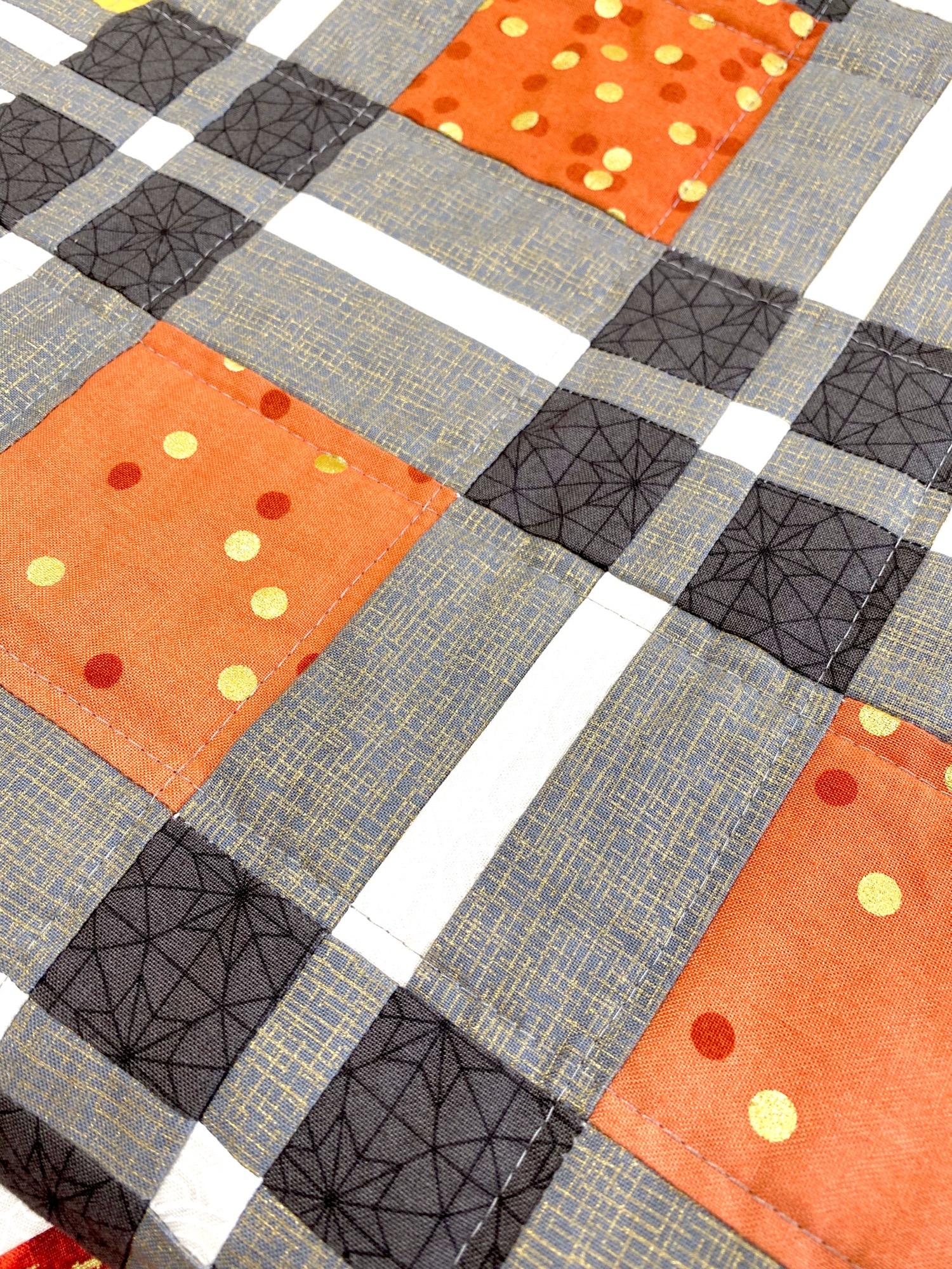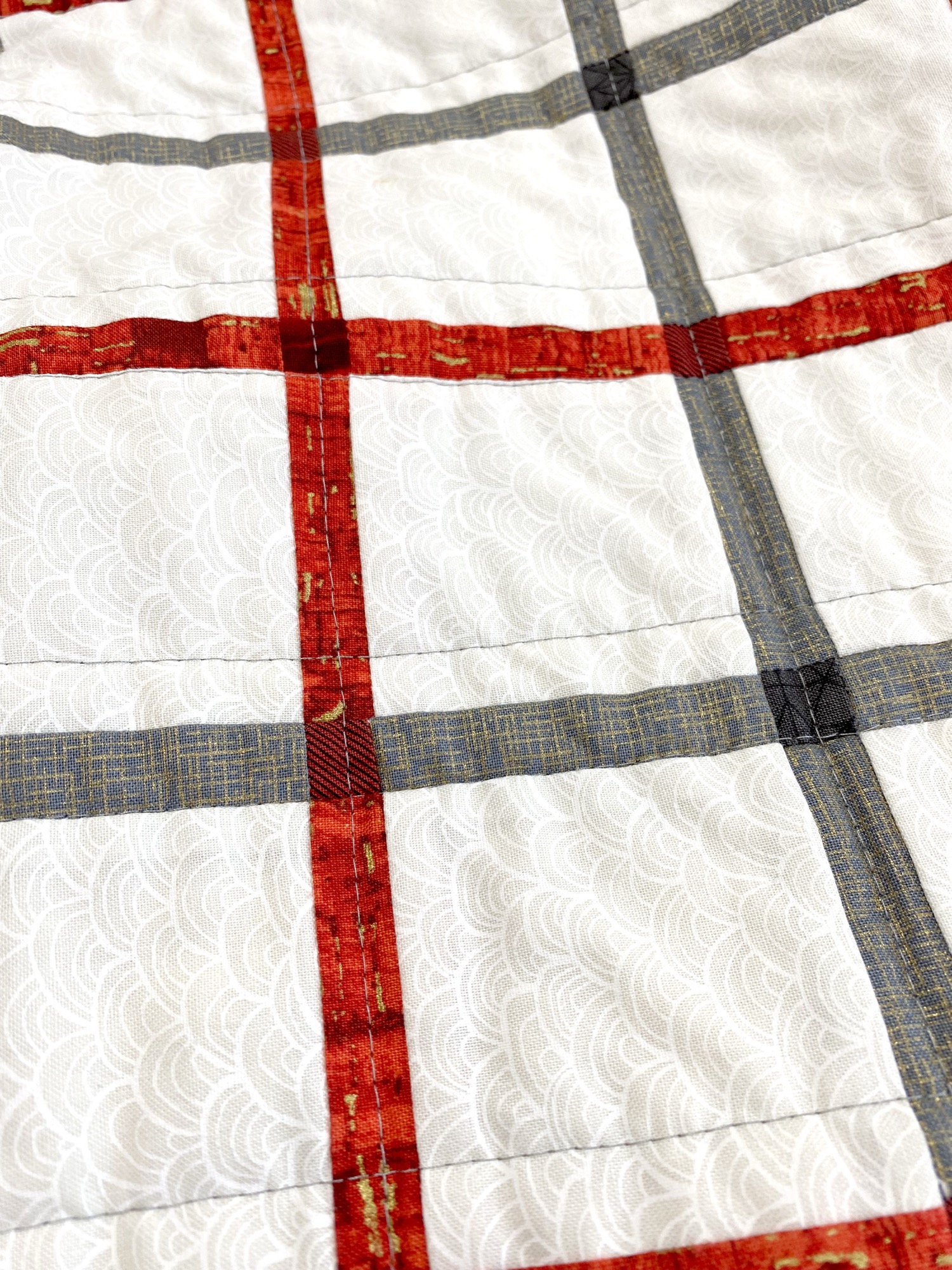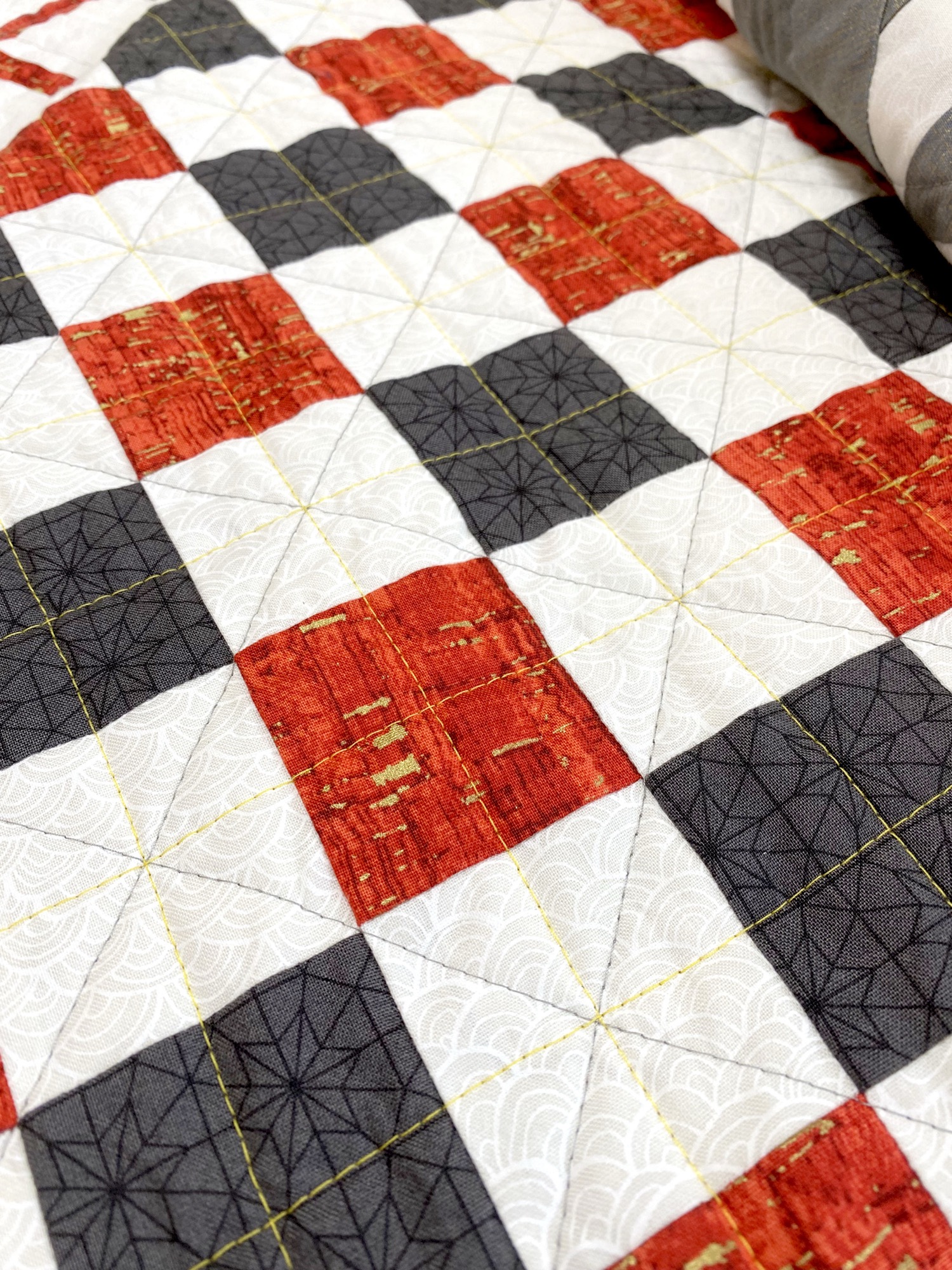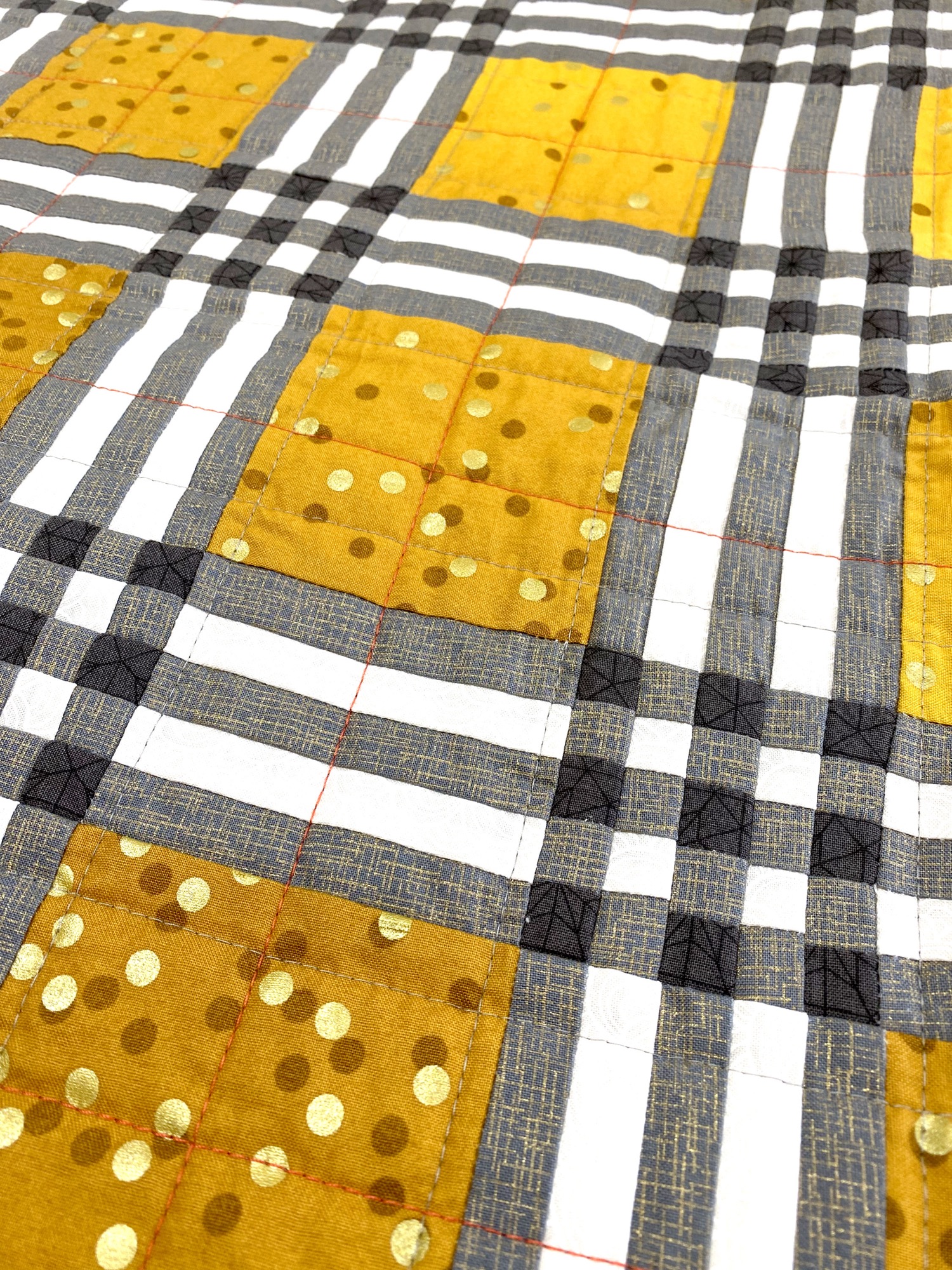 Genäht wurde der Quilt aus reinen Baumwollstoffen, teilweise mit Gold-Metallic-Akzenten, und italienischem Baumwollgarn, und abgefüttert mit einem Baumwollvlies. Sie wurde maschinengenäht und -gequiltet und ist bei 30°C waschbar.