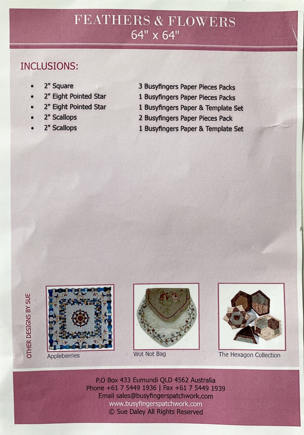 Komplettpaket mit English Paper Piecing Vorlagen und passenden Acryl-Schablonen für den „Feathers & Flowers“ Quilt von Sue Daley. Die Anleitung für den Quilt ist separat erhältlich in ihrem Buch „New English Paper Piecing: A Faster Approach to a Traditional Favourite“ (auch als eBook).