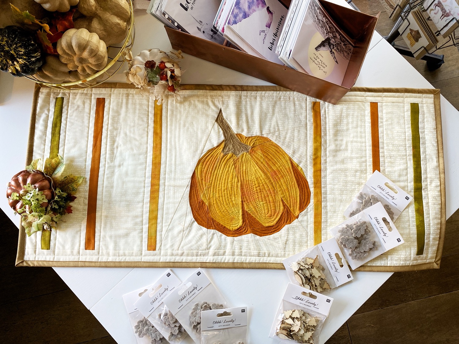 You can find an in-depth free tutorial including video for the “Foundation Paper Piecing” technique as well as information on using the pumpkin motif for a pillowcase or table runner on our blog.