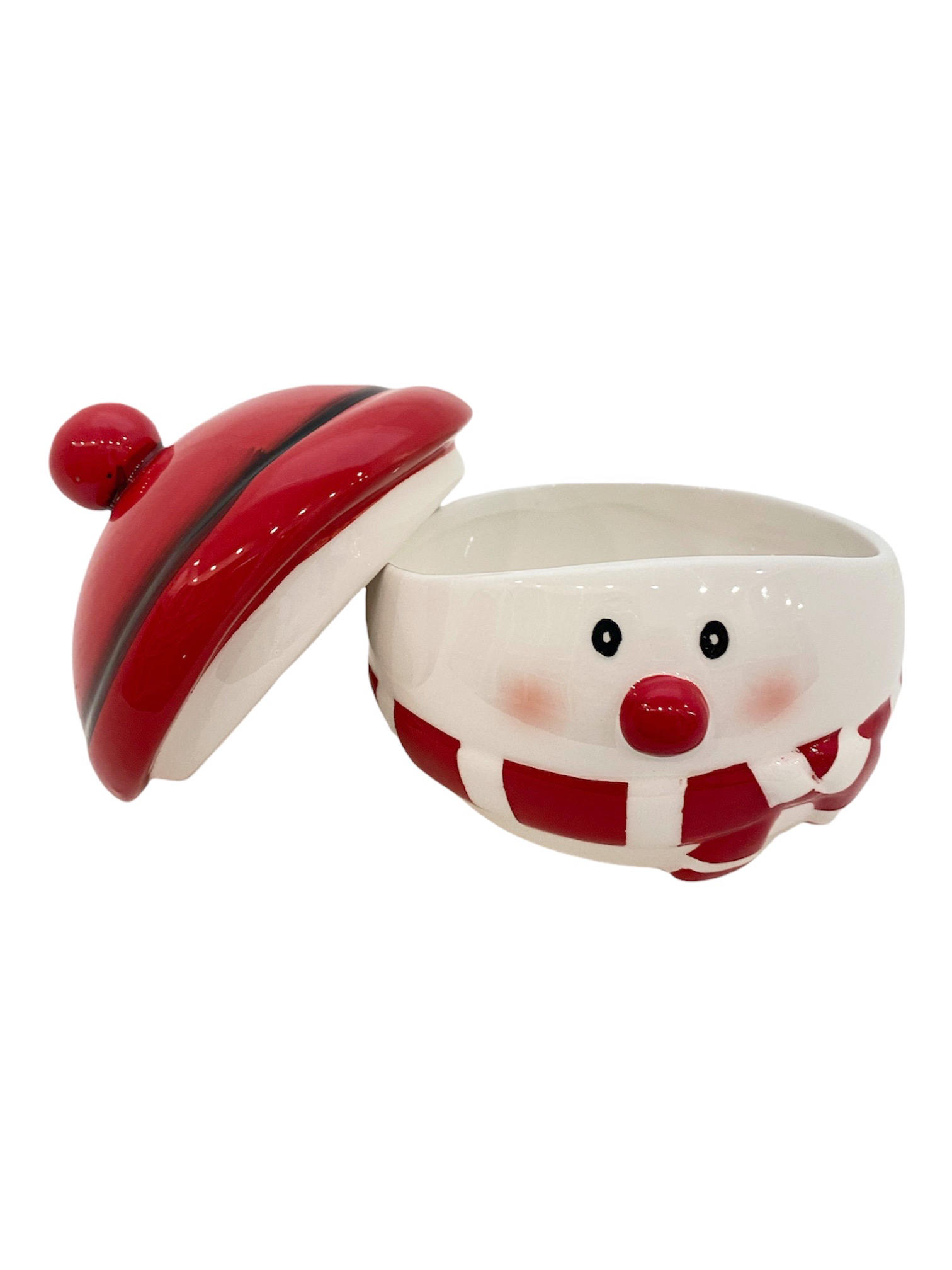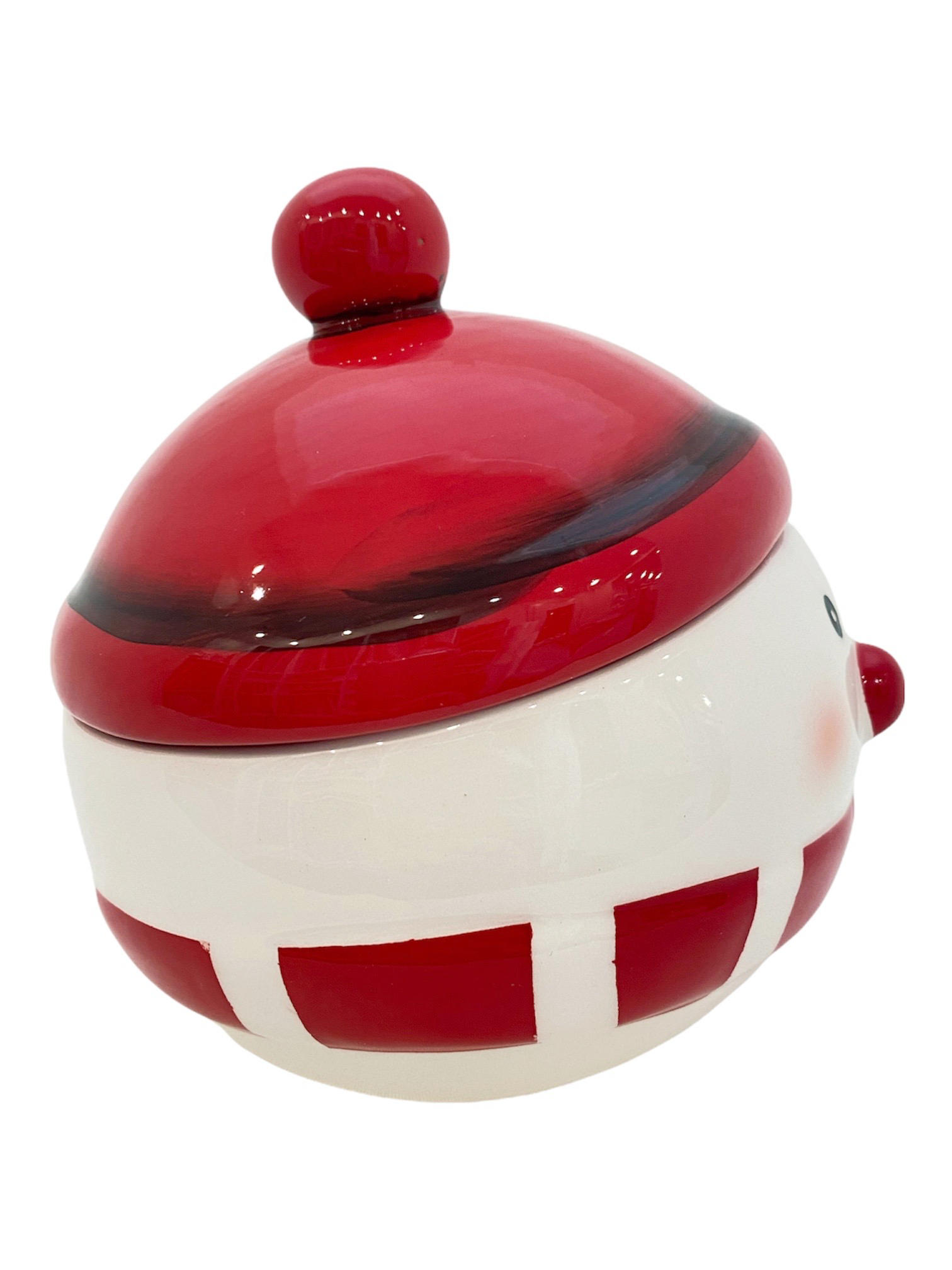 Kleine Gebäckdose aus Keramik in Schneemannform. Zum Befüllen wird die Mütze abgenommen.