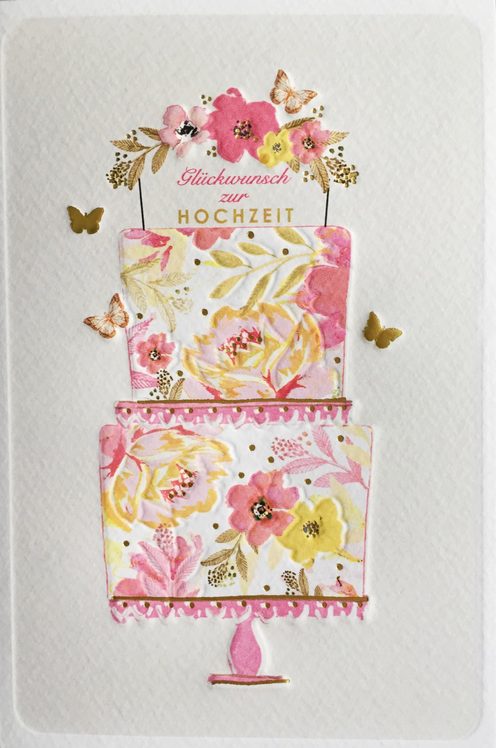 Doppelkarte aus Büttenpapier in Größe B6 (ca. 12 x 17 cm) mit Blind- & Folienprägung und weißem Umschlag