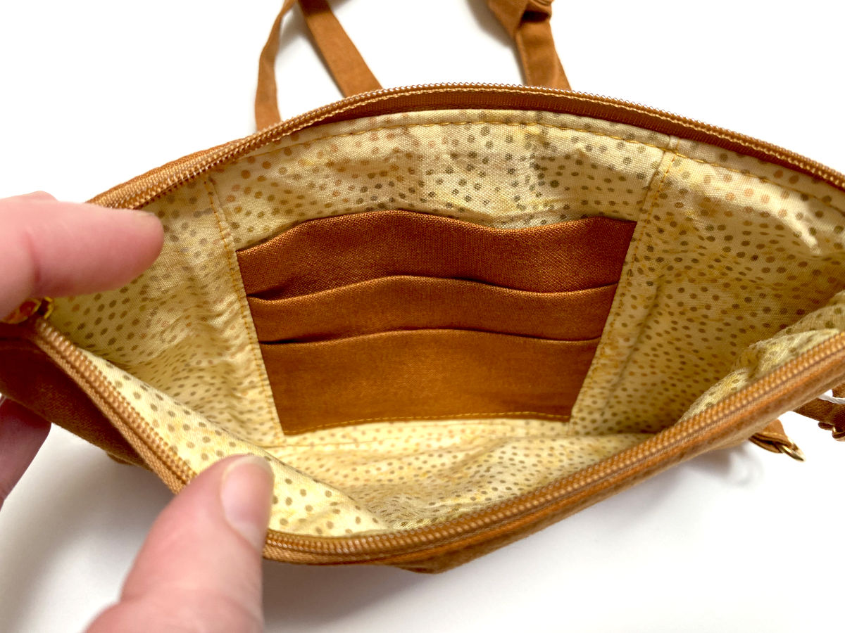 Das Handy findet entweder im vorderen Steckfach mit Lasche und Magnetverschluß Platz oder im großen Reißverschlußfach. Dort findest du auch drei Kartensteckfächer.