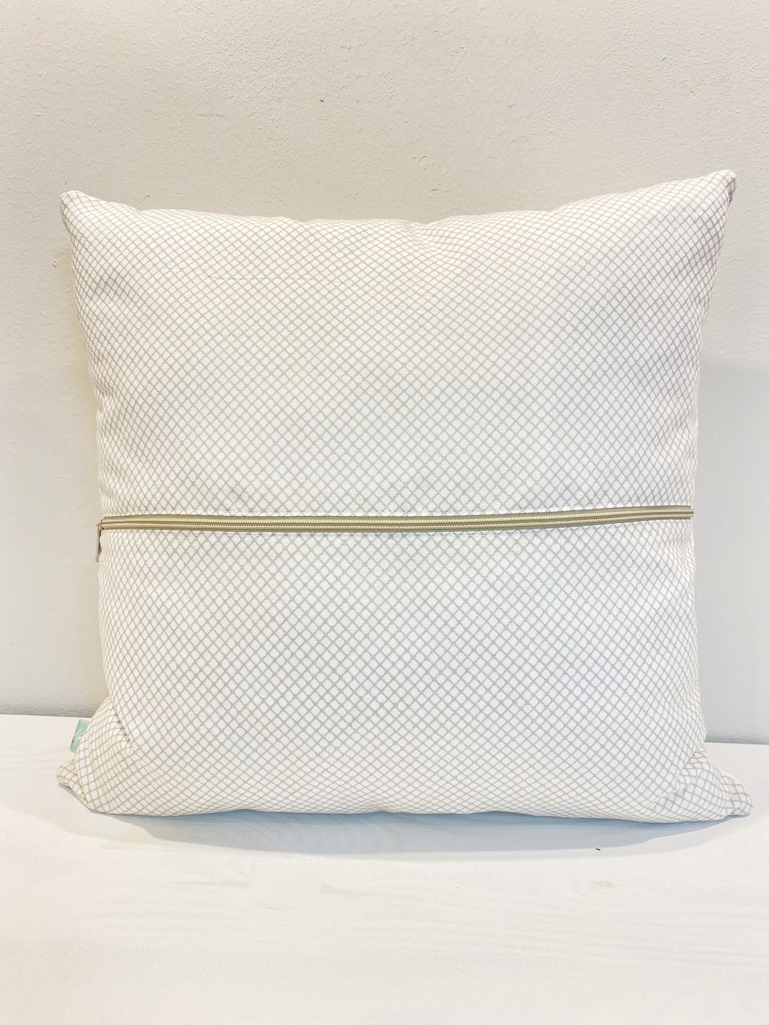 Eine handgefertigte Kissenhülle aus hochwertigen Baumwoll-Designerstoffen in cremé / weiß. Die Vorderseite ist mit einem Baumwollvlies hinterlegt und abgesteppt. Auf der Rückseite befindet sich ein Reißverschluß.