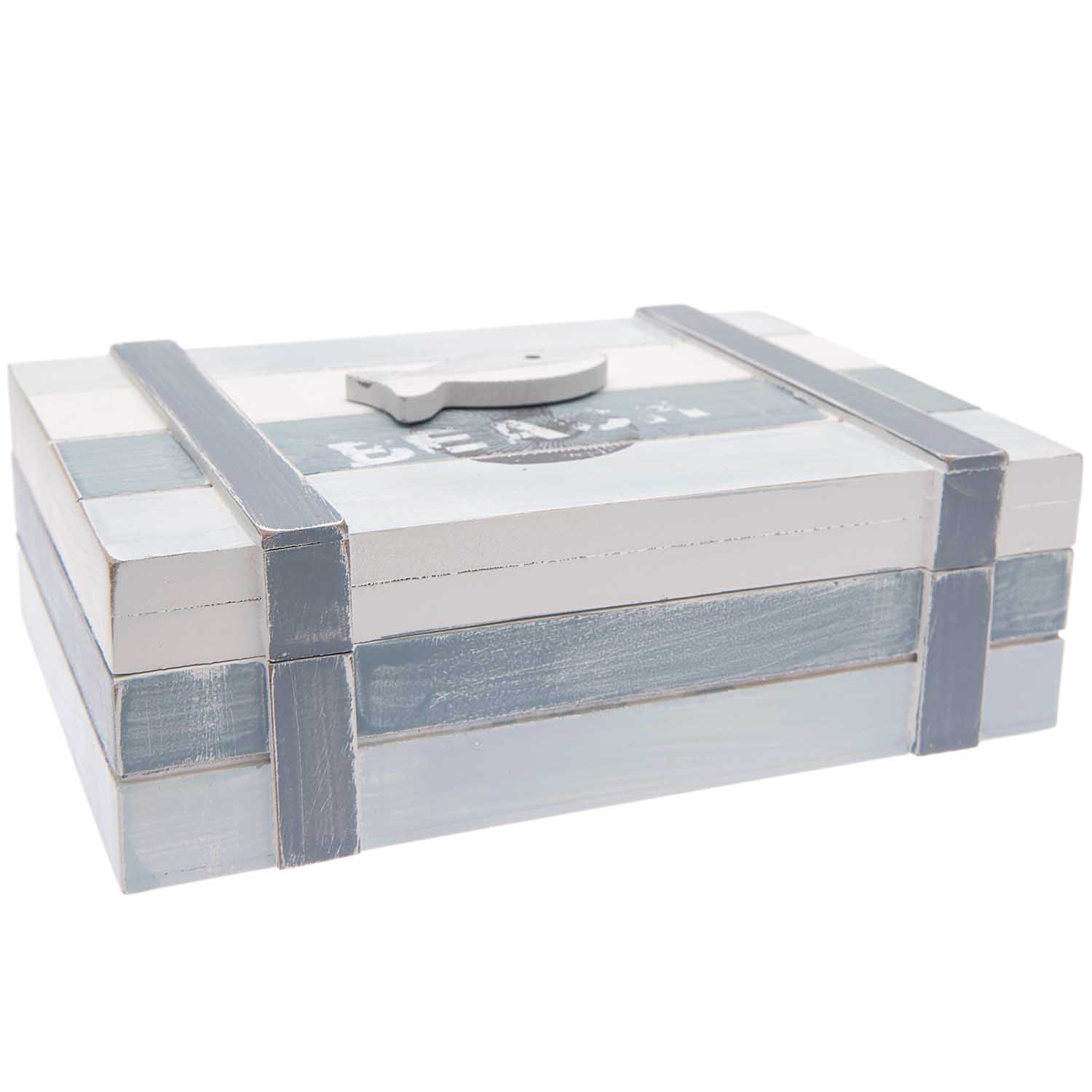Der maritime Holzschatulle in weiß-blau ist der ideale Ort, um Kleinigkeiten wie Urlaubserinnerungen und Souvenirs aufzubewahren. Sie ist aber auch wunderbar einsetzbar als originelle Geschenkverpackung.