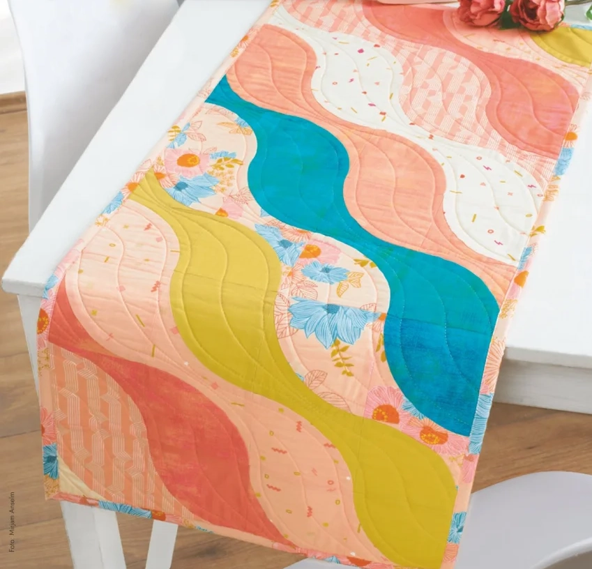 Dies ist die Materialpackung für unseren „Wellen der Freude“-Tischläufer aus dem Patchwork Magazin 4/24.