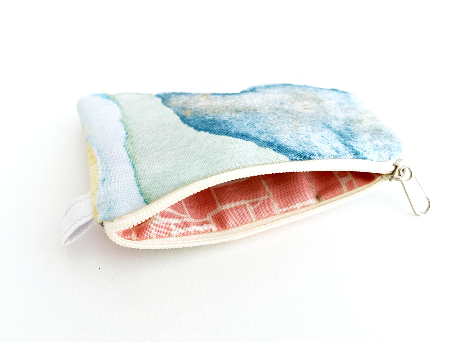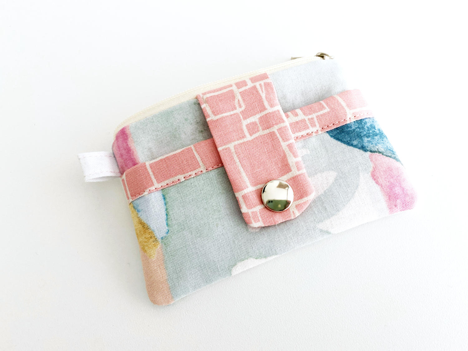 Das kleine Reißverschlußtäschchen eignet sich ideal zum Beispiel als Mini-Geldbörse oder auch als wiederverwendbare Geschenkverpackung für Gutscheine. Im vorderen Fach, das mit einem Druckknopf geschlossen wird, finden alle Karten in Standardgröße Platz, z.B. ec-Karten oder Visitenkarten. Genäht wurde das Täschchen aus reinen Baumwollstoffen, die Außenseite ist mit einer leichten Vlieseline hinterlegt.