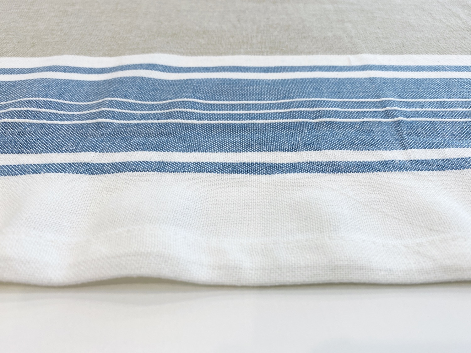 Es gibt keine Webkanten, dafür sind die Kanten bereits eingeschlagen und genäht. Nur die beiden Schnittkanten an den kurzen Seiten müssen noch eingeschlagen und vernäht werden.