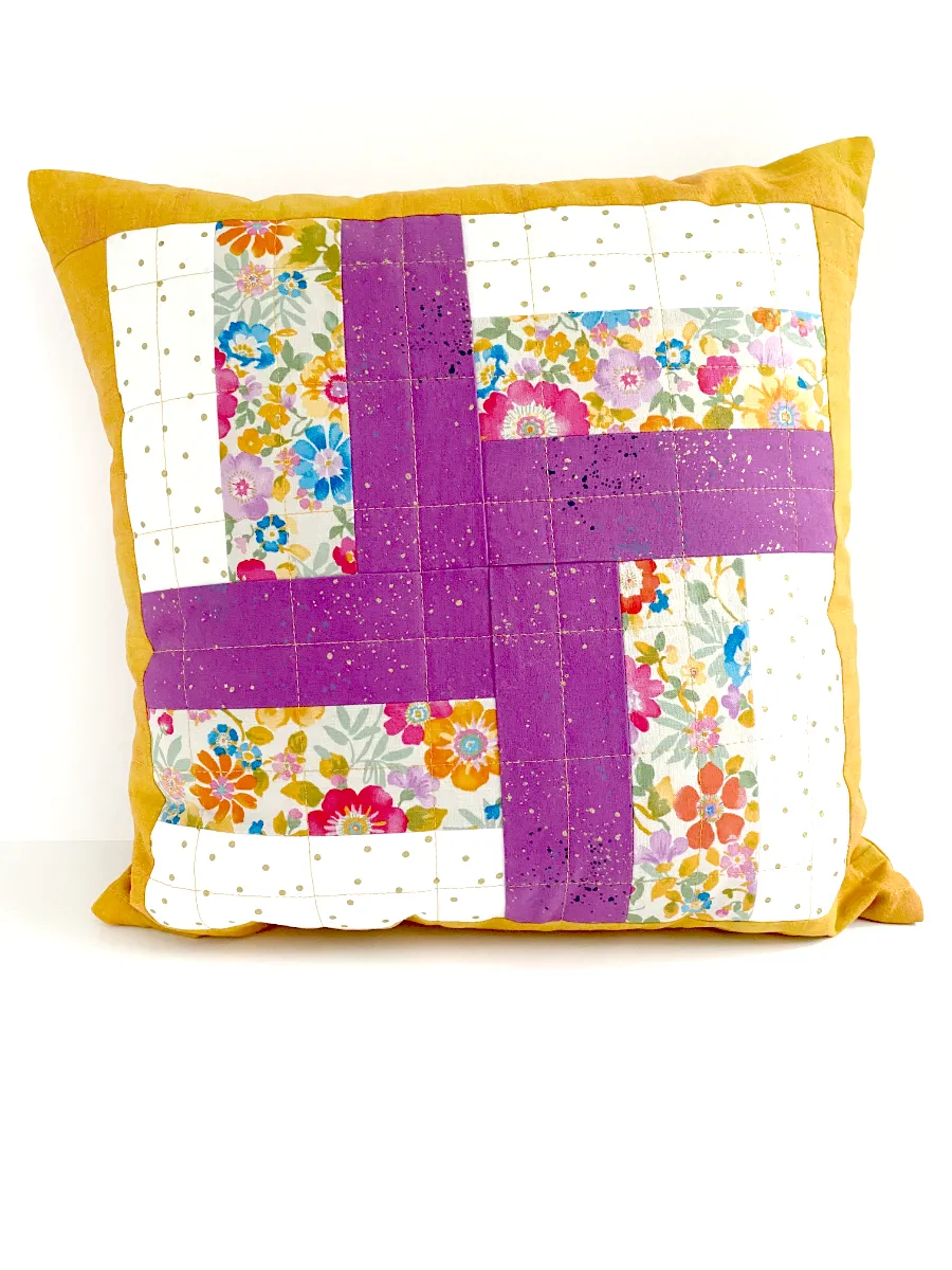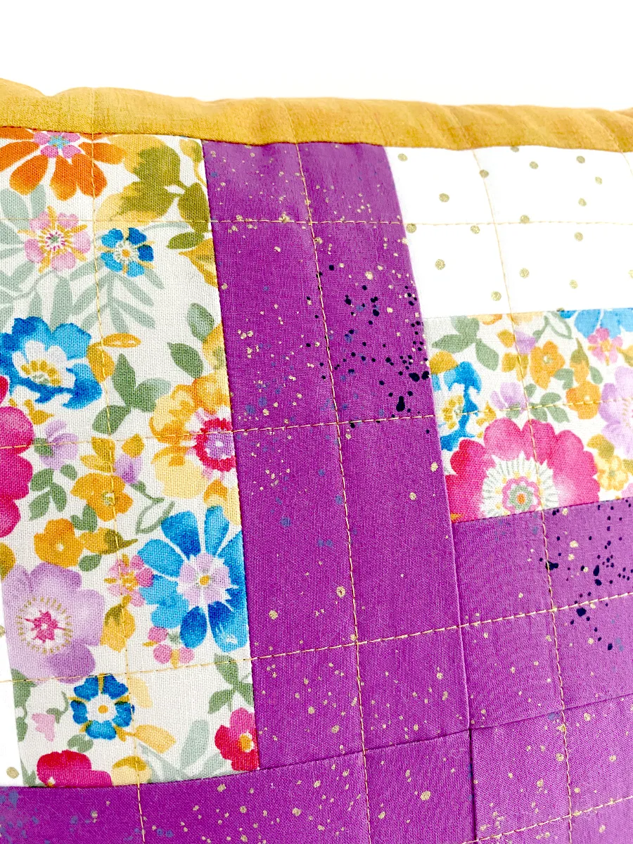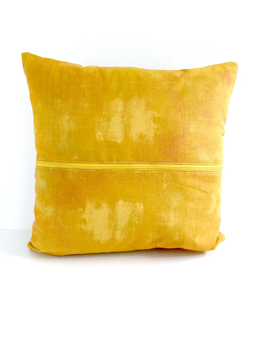 Eine handgefertigte Patchwork-Kissenhülle aus Baumwollstoffen. Die Vorderseite ist mit einem Bambusvlies hinterlegt und wurde abgesteppt. Der Reißverschluß befindet sich mittig auf der Rückseite.