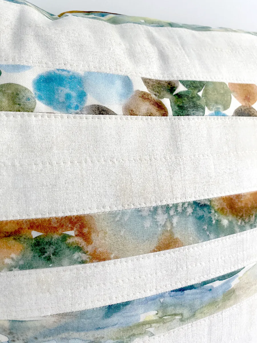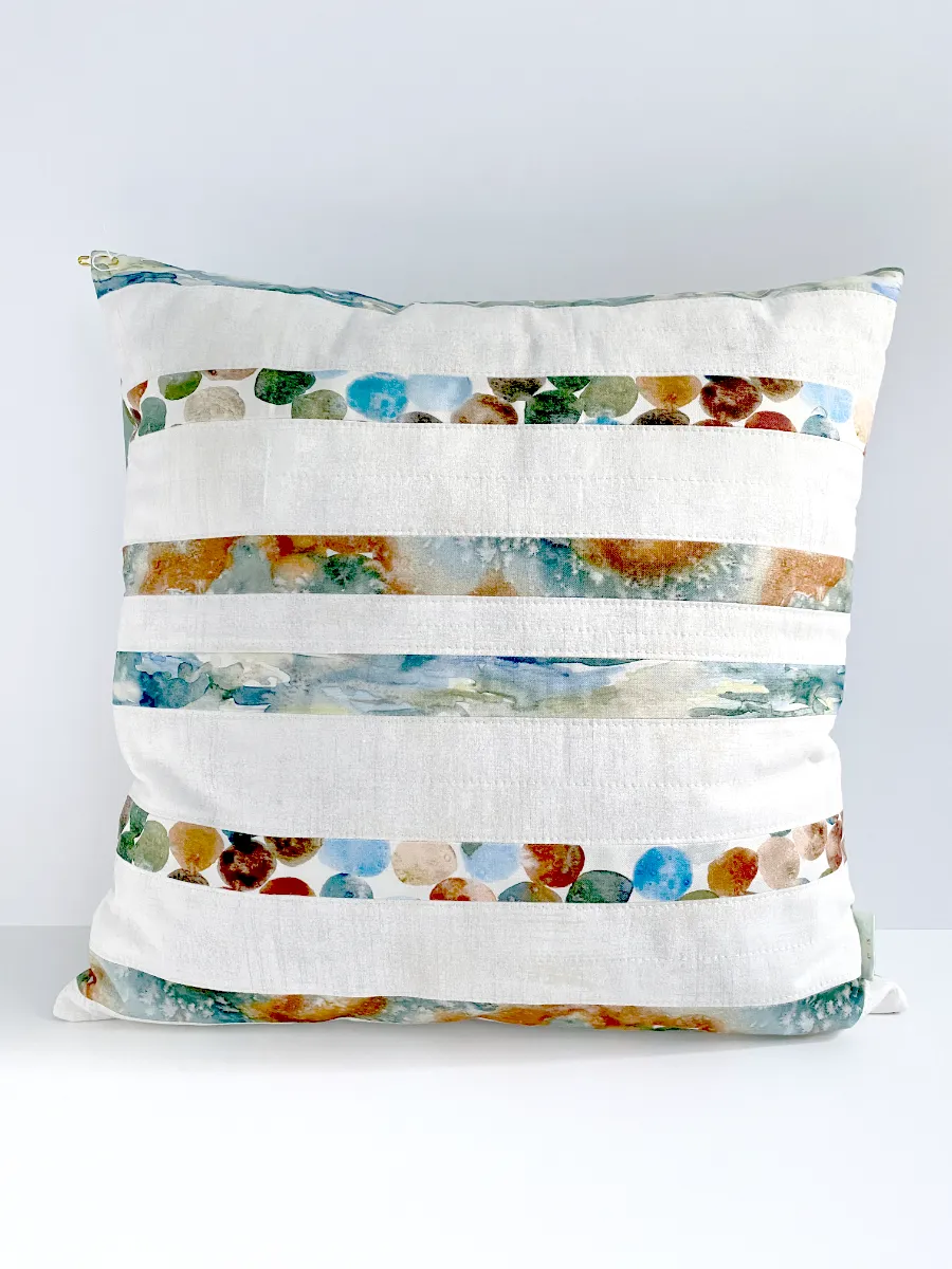Eine handgefertigte Patchwork-Kissenhülle aus Baumwollstoffen. Die Vorderseite ist mit einem Bambusvlies hinterlegt und wurde abgesteppt. Der Reißverschluß befindet sich verdeckt mittig auf der Rückseite.