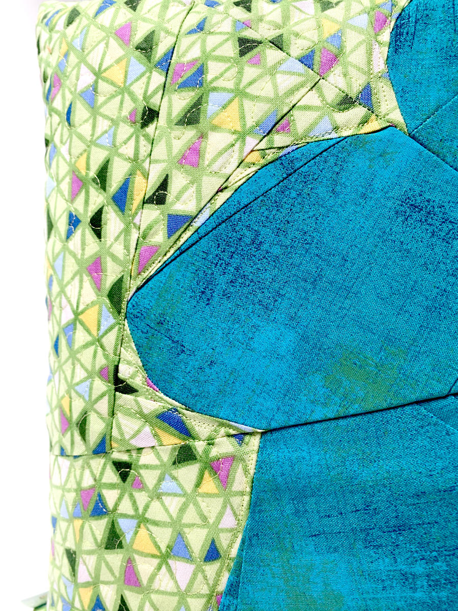 Eine handgefertigte Patchwork-Kissenhülle aus Baumwollstoffen. Die Vorderseite ist mit einem Bambusvlies hinterlegt und wurde leicht abgesteppt. Der Reißverschluß befindet sich auf der Rückseite.
