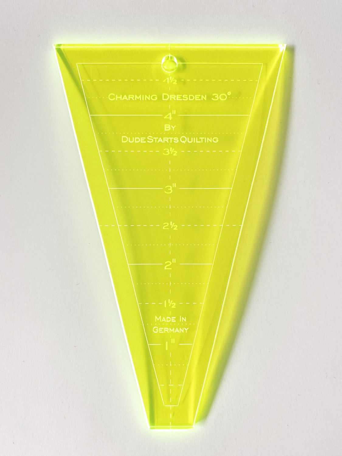 Eine Patchwork-Schablone aus neongelbem Acrylglas mit gefrästen Markierungen für die 1/4″ Nahtzugabe, Mittellinien und Maßangaben.