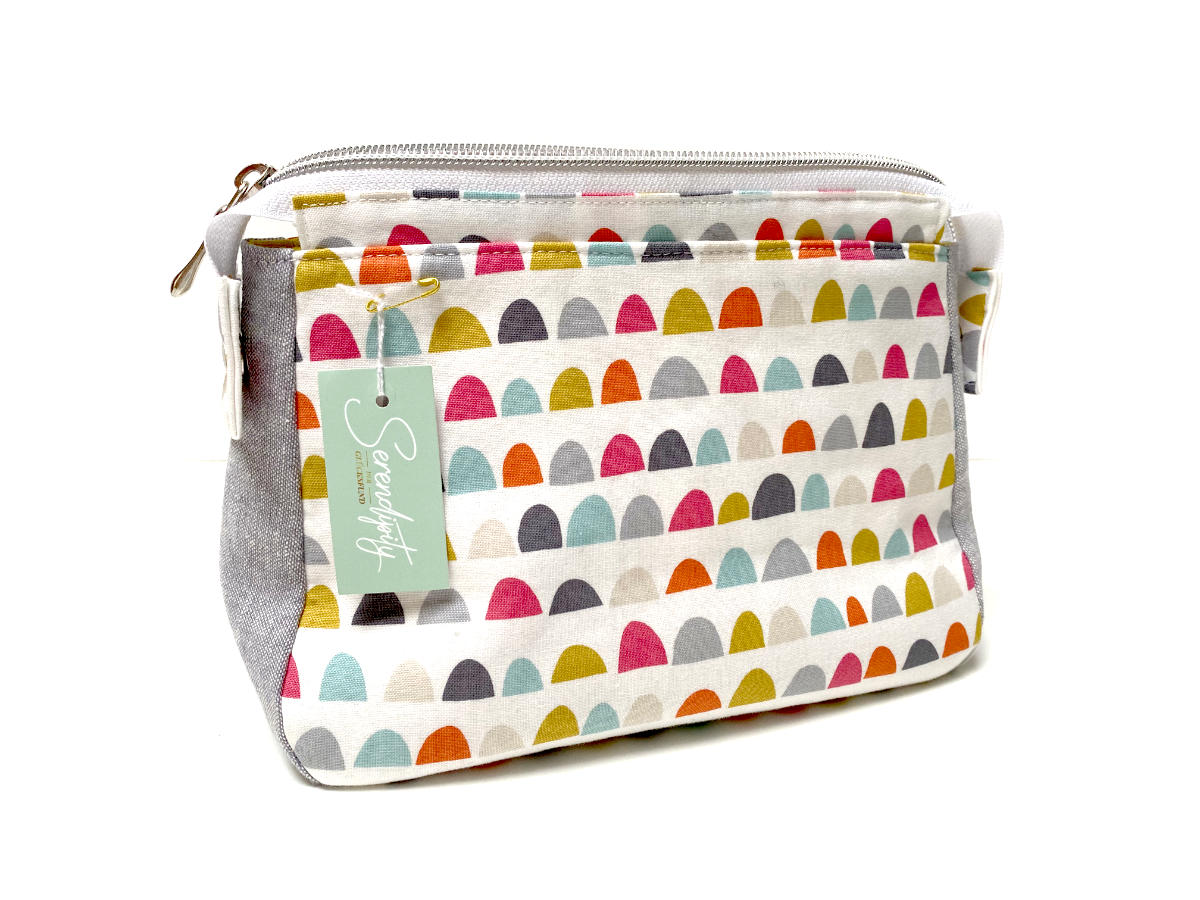 Die Tasche wurde aus unseren Baumwollstoffen genäht, eine leichte (Volumen-)Vlieseinlage gibt ihr Stand, ohne sie steif zu machen oder zu beschweren.
