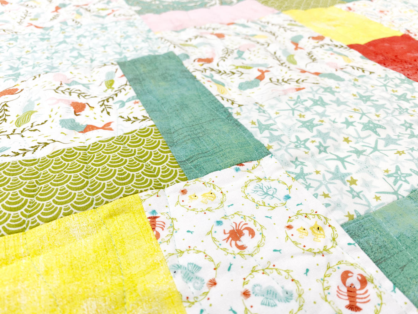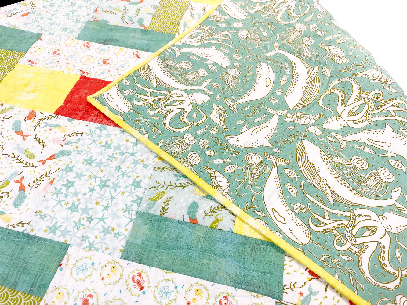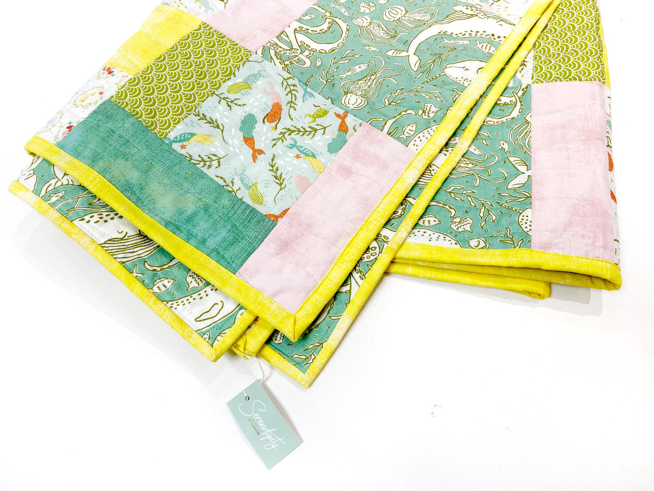 Handgefertigte Patchwork-Decke aus Baumwollstoffen mit farbenfrohen Meerjungfrauen, Fischen und Meerestieren, gefüttert mit einem Bambusvlies. Die Decke misst etwa 1,10 x 1,50 m.
