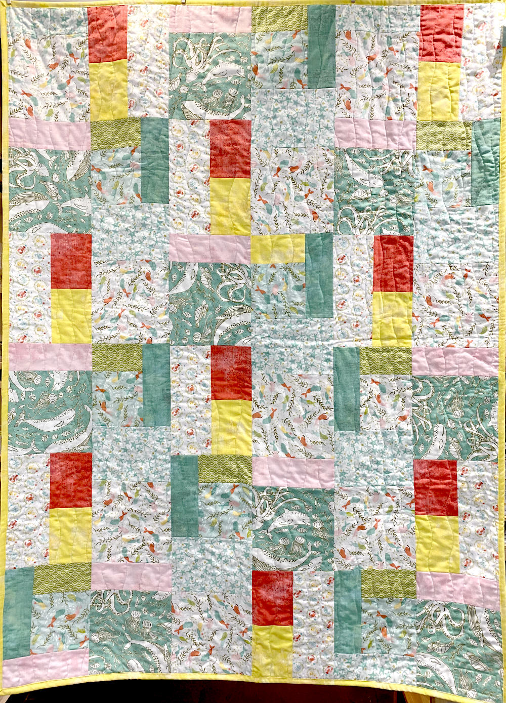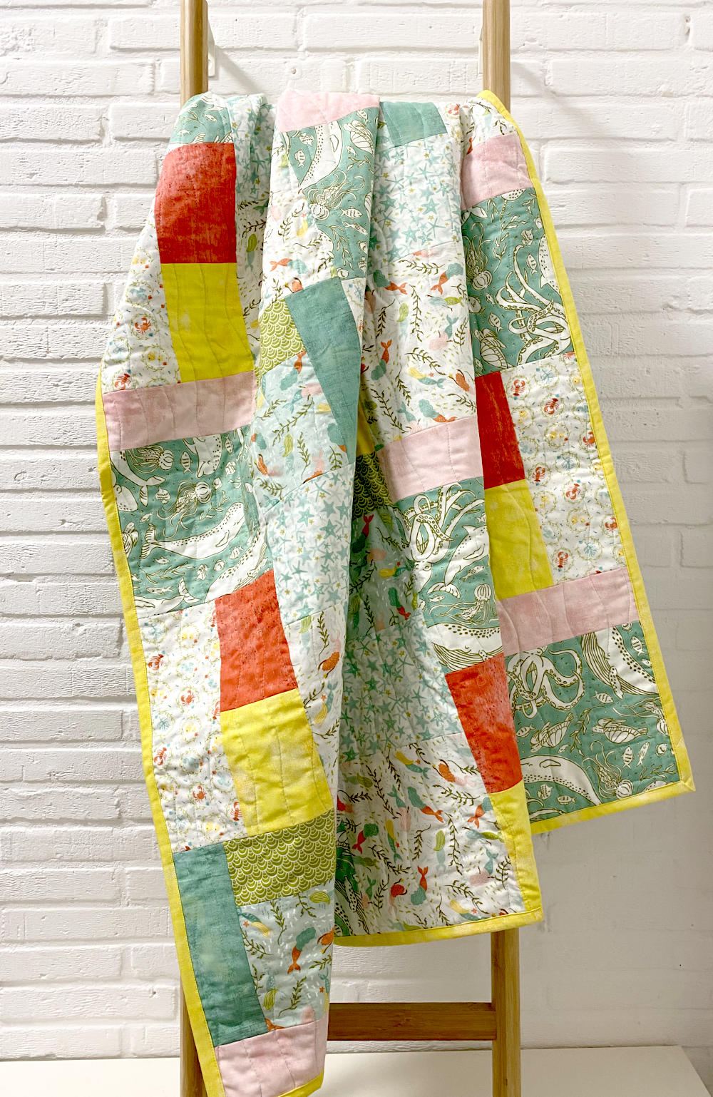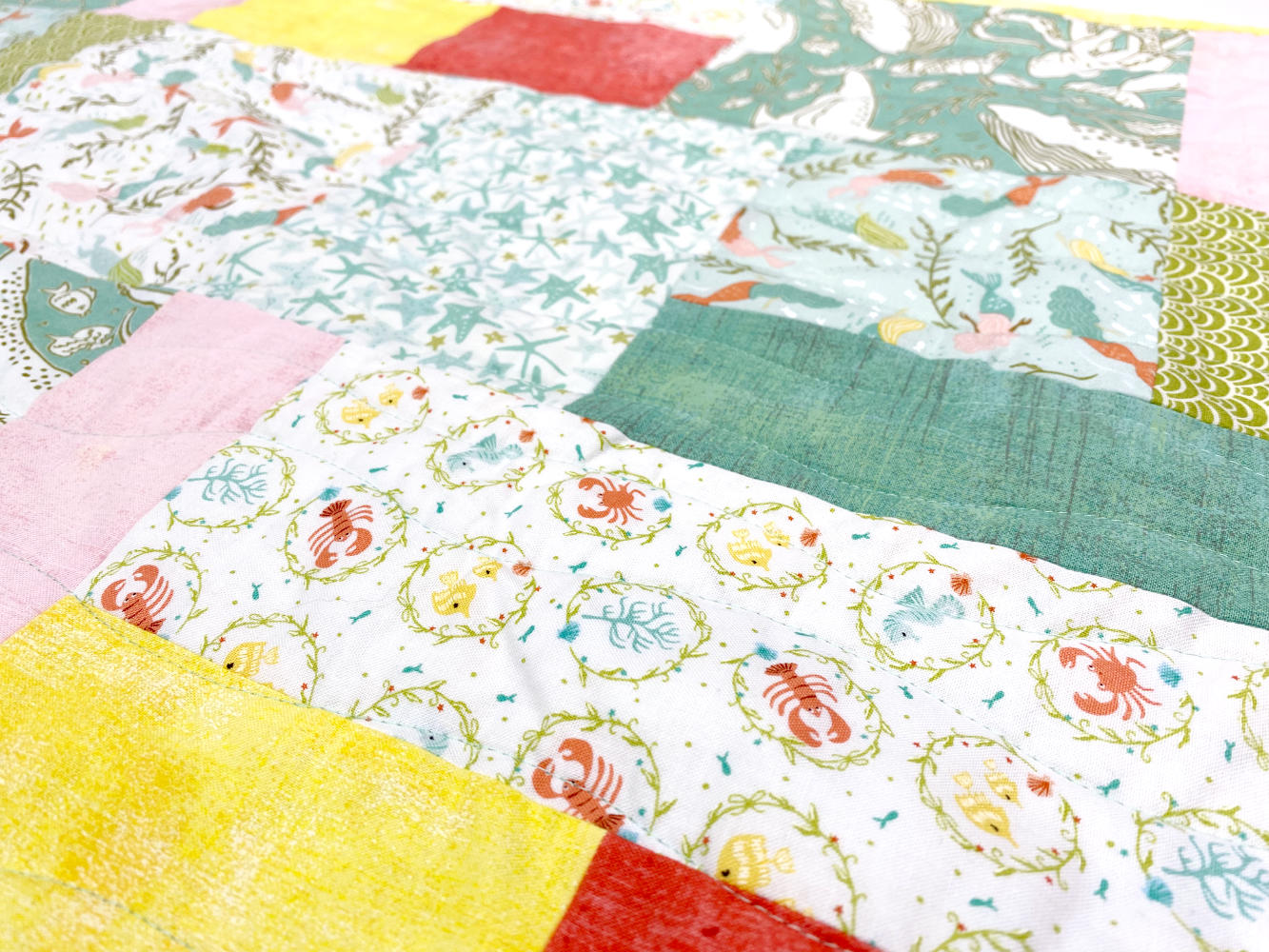 Handgefertigte Patchwork-Decke aus Baumwollstoffen mit farbenfrohen Meerjungfrauen, Fischen und Meerestieren, gefüttert mit einem Bambusvlies. Die Decke misst etwa 1,10 x 1,50 m.