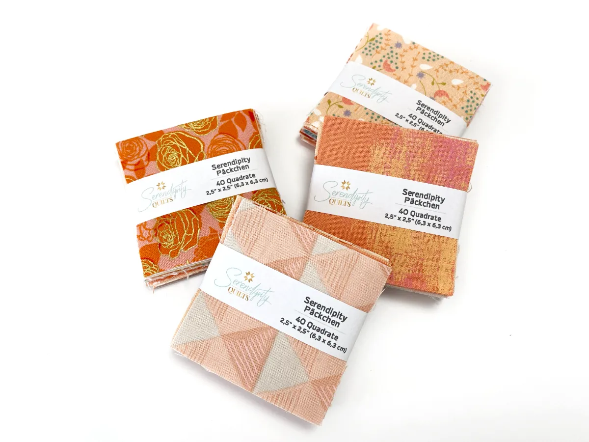 Dieses Päckchen besteht aus 40 Quadraten á 2,5 x 2,5 Inch (6,35 x 6,35 cm) mit Schwerpunkt „Apricot / Koralle“, alle Stoffe sind aus 100% Baumwolle und von unterschiedlichen Patchworkstoff-Herstellern, z.B. Moda, FreeSpirit, Benartex, Windham, ArtGallery, etc.