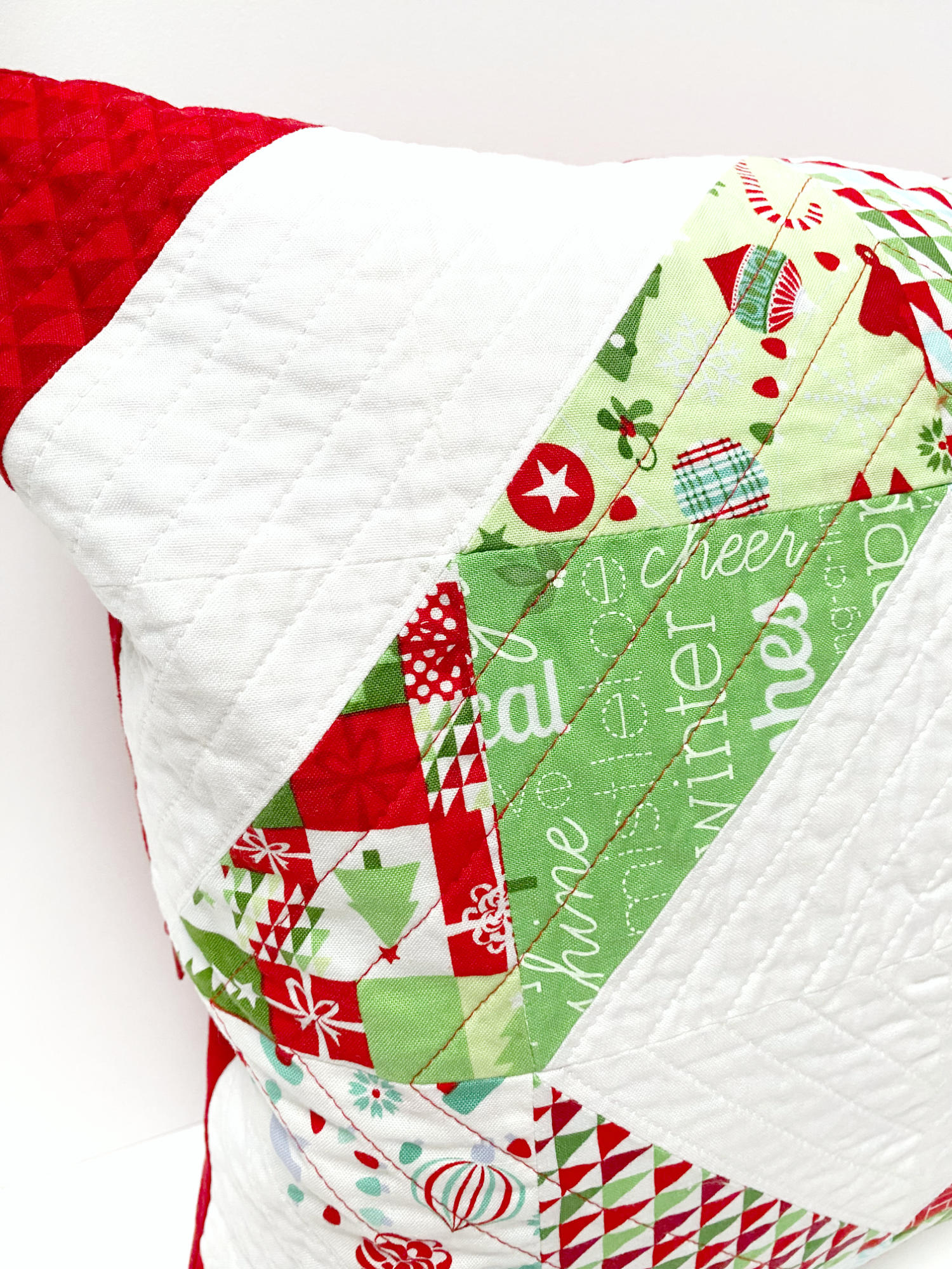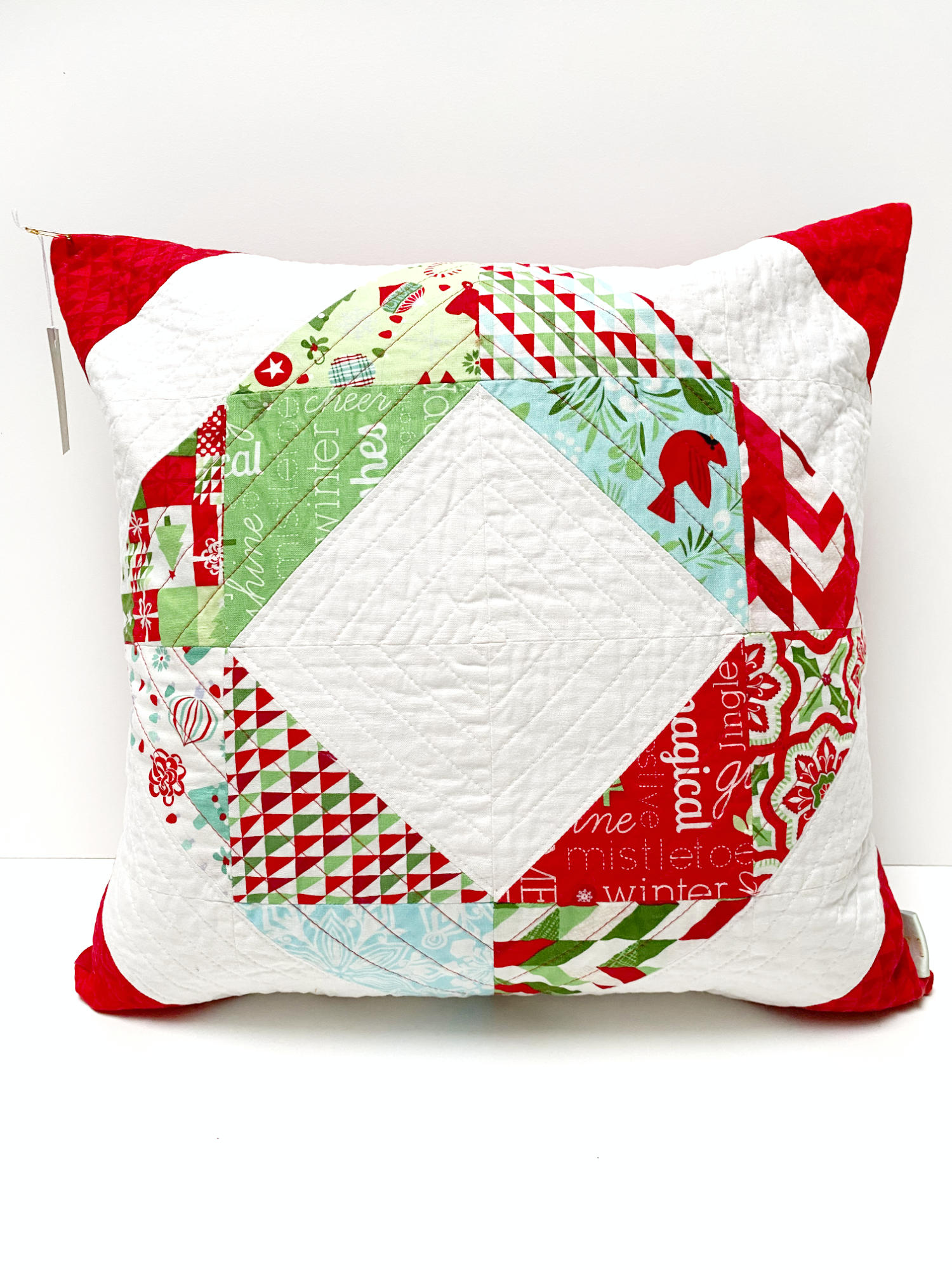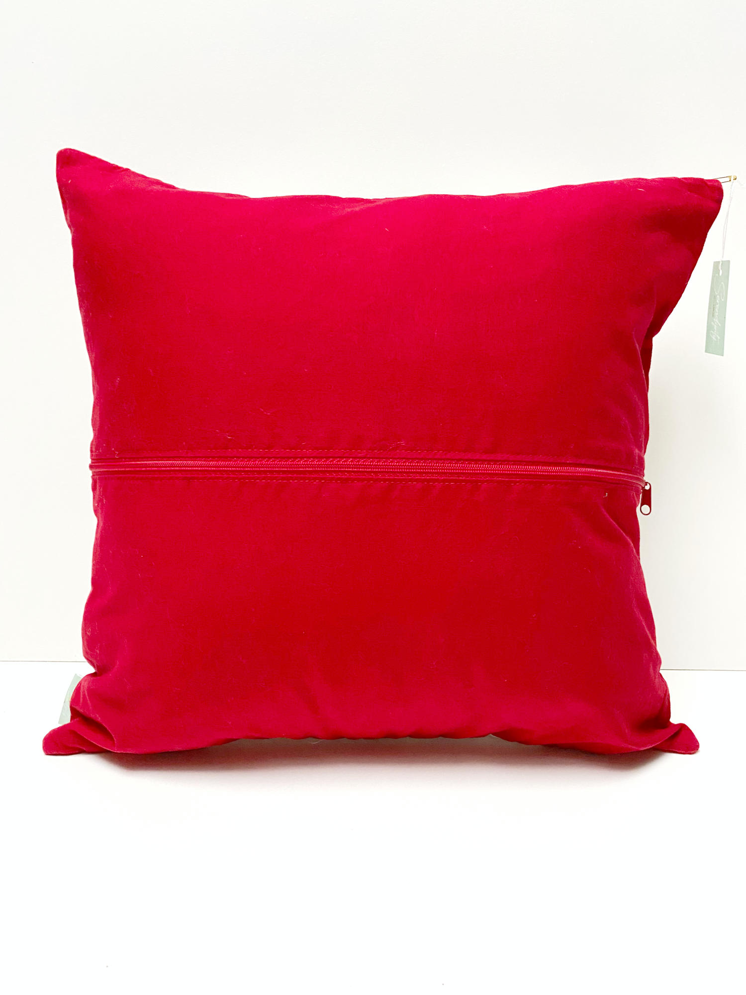 Eine handgefertigte Kissenhülle aus Baumwollstoffen. Die Vorderseite ist mit Vlies hinterlegt und abgesteppt. Der Reißverschluß befindet sich mittig auf der uni roten Rückseite.