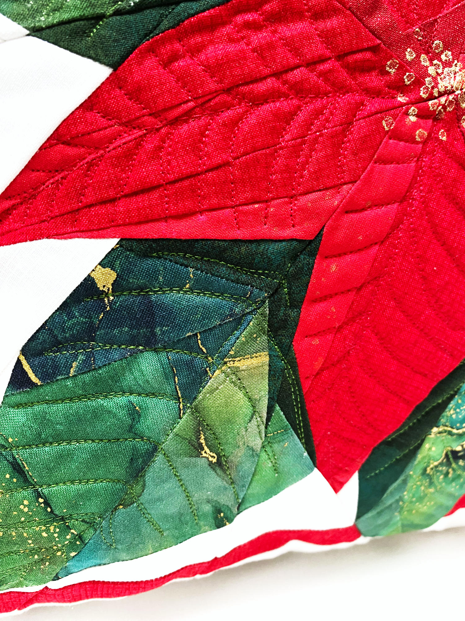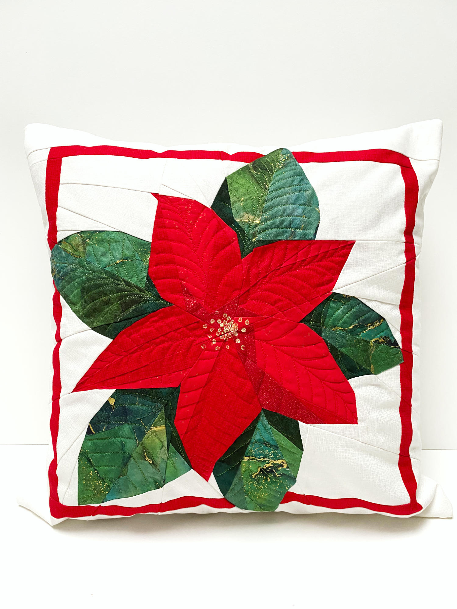 Eine handgefertigte Kissenhülle aus Baumwollstoffen, teilweise mit leichten Gold-Akzenten, genäht nach einem eigenen Entwurf. Die Vorderseite ist mit Vlies hinterlegt und abgesteppt. Der Reißverschluß befindet sich mittig auf der Rückseite.