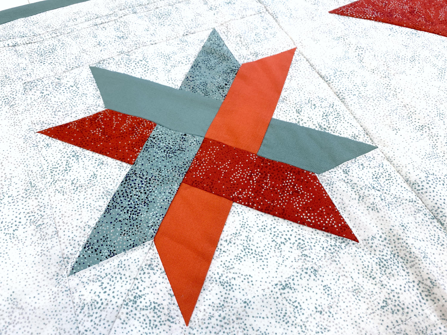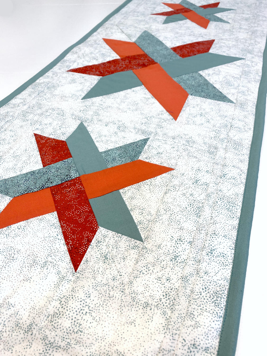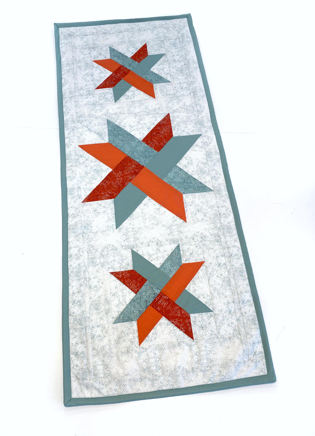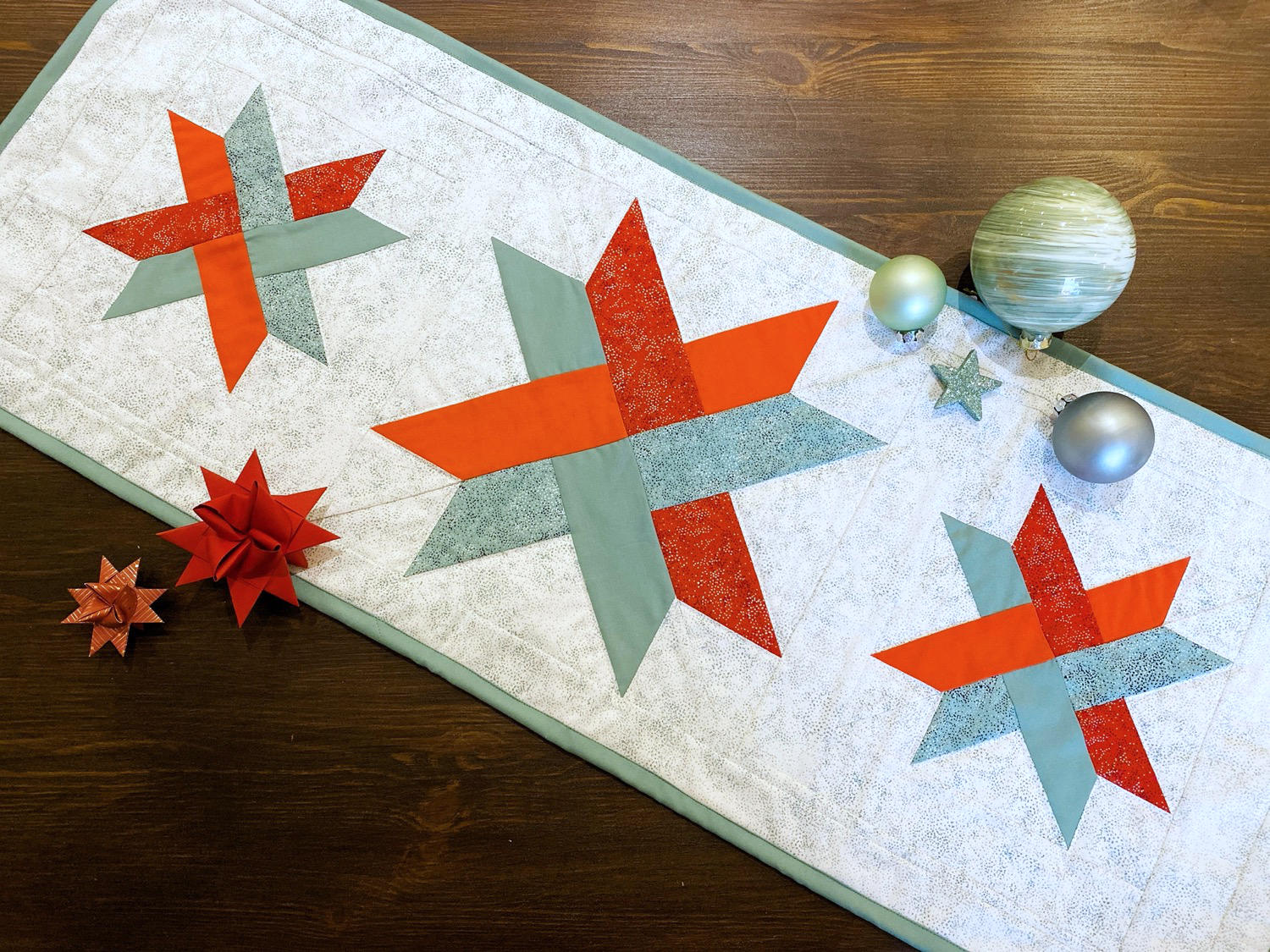 Handgefertigter Patchwork-Tischläufer mit Sternen aus Baumwollstoffen der Firma Moda mit Silber-Metallic-Effekten, gefüttert mit Thermolam (100% Polyester). Die Rückseite ist uni weiß. Der Läufer misst etwa 1,00 x 0,40 m.