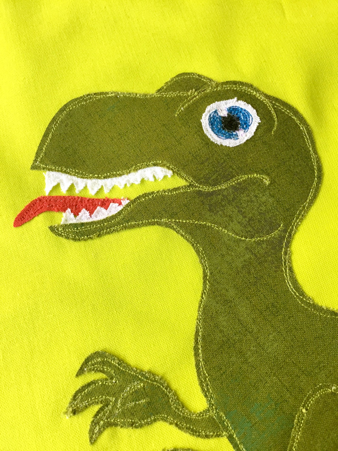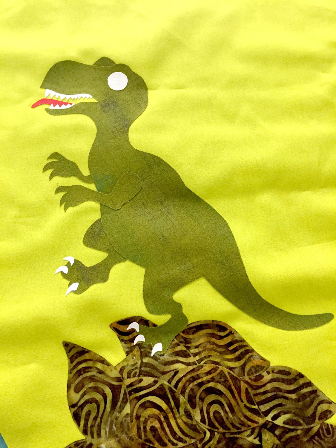 Wenn die Größe stimmt übertrage ich alle Teile des Motivs zuerst auf ein Medium wie „Lite Steam-A-Seam 2“, schneide diese grob aus, bügle sie dann auf die linke Seite der Stoffe, die ich mir ausgesucht habe und schneide sie entlang der aufgemalten Linien aus. So kann man den Stoff ausschneiden als wäre er Papier und die Teile behalten schön ihre Form. Dann positioniere ich alle Teile auf dem Hintergrundstoff und wenn’s mir gefällt, bügle ich alles fest. Um die Applikation richtig zu fixieren und den Motiven mehr Ausdruck zu verleihen, „male“ ich mit der Nähmaschine entlang der Konturen und kann so auch viele Details und Strukturen herausarbeiten. Außerdem gefällt mir der skizzen-artige Look sehr gut.
